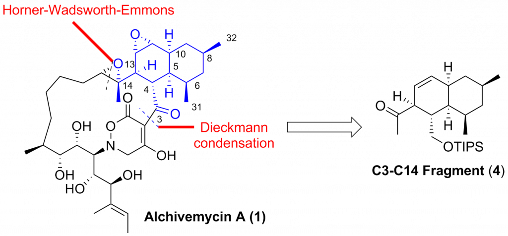 We report our synthetic studies towards the synthesis of the C3-C14 fragment of alchivemycin A. The synthesis featured an asymmetric alkylation with excellent diastereoselectivity and a one-pot Julia-Kocienski olefination with excellent E-selectivity. Intramolecular Diels-Alder reaction was employed to construct the highly functionalized cis-decalin framework. Interestingly, the stereochemical outcome was unexpected to generate two stereoisomers 20 and 21 instead of the desired cis-decalin 5. Detailed mechanism for this transformation was discussed. These synthetic endeavors have offered us a number of crucial insights for the synthesis of the complex natural product alchivemycin A.