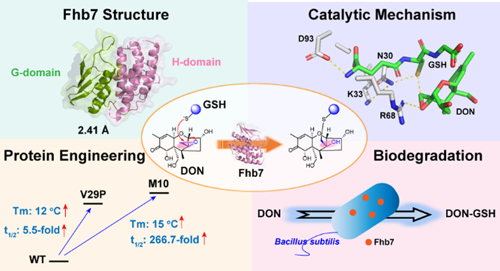In the era of global climate change, the increasingly severe Fusarium head blight (FHB) and deoxynivalenol (DON) contamination have caused economic losses and brought food and feed safety concerns. Recently, an FHB resistance gene Fhb7 coding a glutathione-S transferase (GST) to degrade DON by opening the critical toxic epoxide moiety was identified and opened a new window for wheat breeding and DON detoxification. However, the poor stability of Fhb7 and the elusiveness of the catalytic mechanism hinder its practical application. Herein, we report the first structure of Fhb7 at 2.41 Å and reveal a unique catalytic mechanism of epoxide opening transformation in GST family proteins. Furthermore, variants V29P and M10 showed that 5.5-fold and 266.7-fold longer half-life time than wild-type, respectively, were identified. These variants offer broad substrate scope, and the engineered biosafe Bacillus subtilis overexpressing the variants shows excellent DON degradation performance, exhibiting potential at bacterium engineering to achieve DON detoxification in the feed and biomedicine industry. This work provides a profound mechanistic insight into the enzymatic activities of Fhb7 and paves the way for further utilizing Fhb7-related enzymes in crop breeding and DON detoxification by synthetic biology.