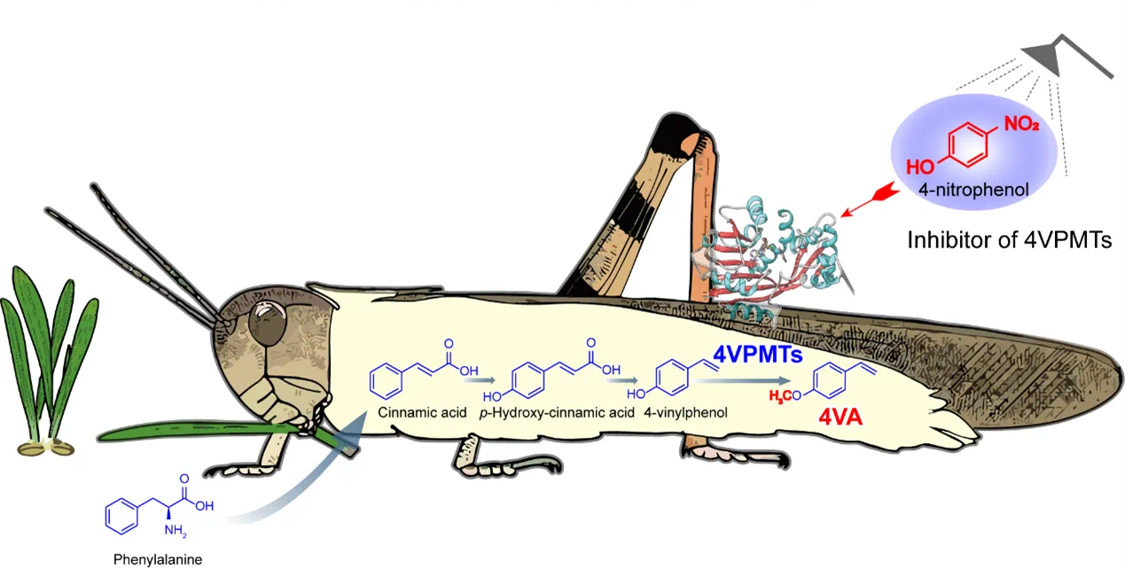 Aggregation pheromone, 4-vinylanisole (4VA), is specifically released by gregarious migratory locusts, and is crucial in forming locust swarms that cause destructive plagues1. Control of locust plagues relies heavily on the extensive application of chemical pesticides, which has led to severe environmental and health issues2. As pheromones are primary mediators of insect communication and behaviour3, exploring their biosynthesis can provide important cues to develop innovative behavioural regulators, potentially reducing the reliance on chemical pesticides. Here we resolve the biosynthesis of 4VA and behavioural responses of locusts when enzymes in the 4VA biosynthetic pathway are manipulated. The process initiates with phenylalanine derived from food plants and proceeds through three precursors: cinnamic acid, p-hydroxycinnamic acid and 4-vinylphenol (4VP). Notably, the conversion from 4VP to 4VA through methylation is unique to gregarious locusts. This step is catalysed by two crucial methyltransferases, 4VPMT1 and 4VPMT2. Guided by the X-ray co-crystal structure of 4VPMT2 bound with 4VP and S-adenosyl-L-methionine, we developed 4-nitrophenol as a substrate surrogate. We identified several chemicals that can block 4VA production by inhibiting the enzymatic activities of 4VPMT proteins, thereby suppressing locust aggregative behaviour. The findings uncover the chemical logic behind 4VA biosynthesis and pinpoint two crucial enzymes as novel targets for locust swarm management.