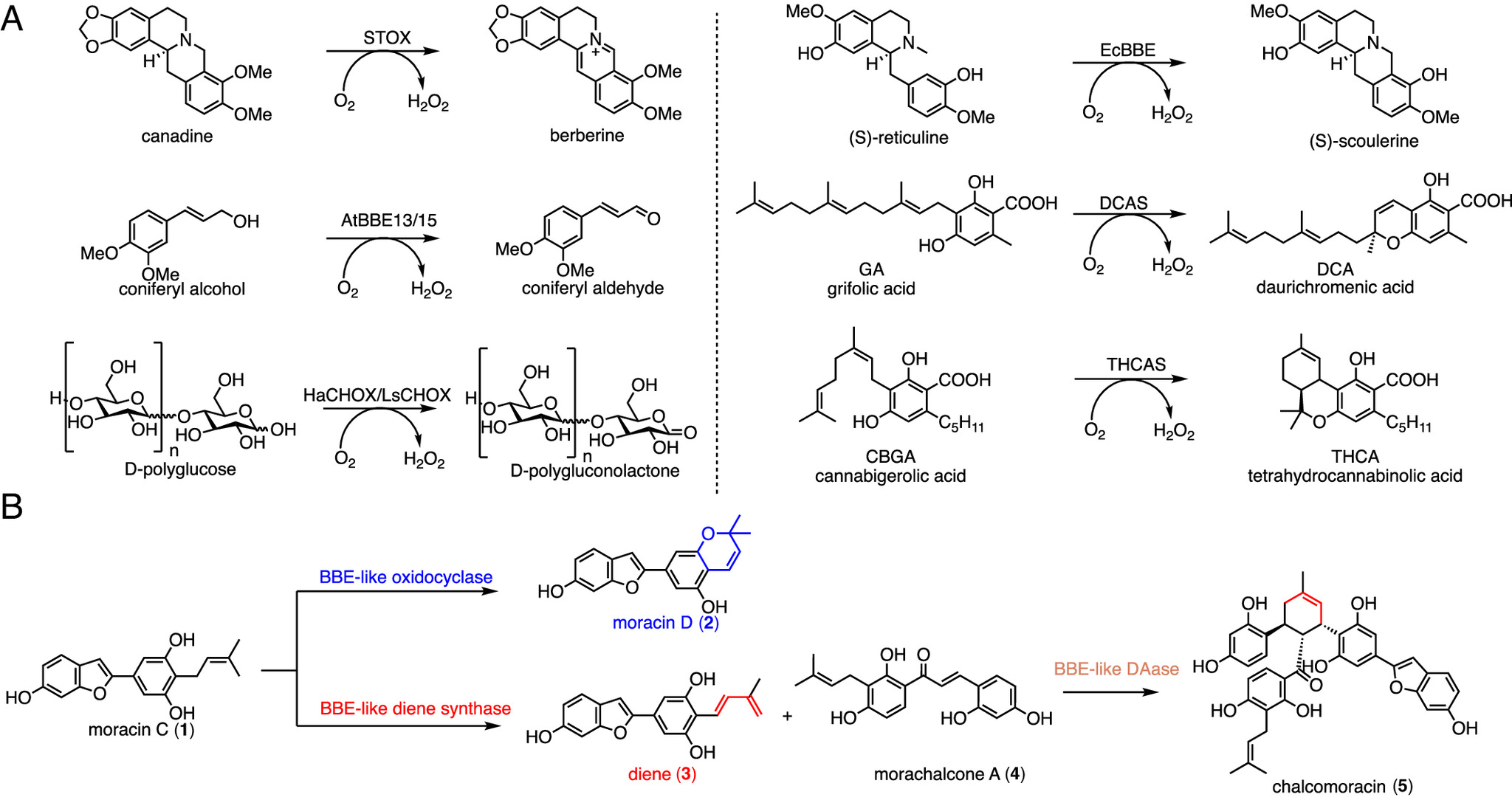 Berberine bridge enzyme (BBE)-like enzymes catalyze various oxidative cyclization and dehydrogenation reactions in natural product biosynthesis, but the molecular mechanism underlying the selectivity remains unknown. Here, we elucidated the catalytic mechanism of BBE-like oxidases from Morus alba involved in the oxidative cyclization and dehydrogenation of moracin C. X-ray crystal structures of a functionally promiscuous flavin adenine dinucleotide (FAD)–bound oxidase, MaDS1, with and without an oxidative dehydrogenation product were determined at 2.03 Å and 2.21 Å resolution, respectively. Structure-guided mutagenesis and sequence analysis have identified a conserved aspartic acid that directs the reaction toward the oxidative dehydrogenation pathway. A combination of density functional theory (DFT) calculations and molecular dynamics (MD) simulations has revealed that aspartic acid acts as the catalytic base to deprotonate the carbon-cation intermediate to generate the dehydrogenated product, which otherwise undergoes a spontaneous 6π electrocyclization in the oxidative cyclization pathway to furnish the 2H-benzopyran product.