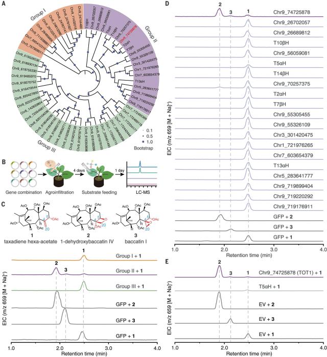 Bin Jiang†, Lei Gao†, Haijun Wang†, Yaping Sun†, Xiaolin Zhang, Han Ke, Shengchao Liu,Pengchen Ma, Qinggang Liao, Yue Wang, Huan Wang, Yugeng Liu, Ran Du, Torben Rogge, Wei Li, Yi Shang, K. N. Houk, Xingyao Xiong, Daoxin Xie, Sanwen Huang, Xiaoguang Lei*, Jianbin Yan* Science, 2024, 383(6681), 622-629. Paclitaxel is a well known anticancer compound. Its biosynthesis involves the formation of a highly functionalized diterpenoid core skeleton (baccatin III) and the subsequent assembly of a phenylisoserinoyl side chain. Despite intensive investigation for half a century, the complete biosynthetic pathway of baccatin III remains unknown. In this work, we identified a bifunctional cytochrome P450 enzyme [taxane oxetanase 1 (TOT1)] in Taxus mairei that catalyzes an oxidative rearrangement in paclitaxel oxetane formation, which represents a previously unknown enzyme mechanism for oxetane ring formation. We created a screening strategy based on the taxusin biosynthesis pathway and uncovered the enzyme responsible for the taxane oxidation of the C9 position (T9αH1). Finally, we artificially reconstituted a biosynthetic pathway for the production of baccatin III in tobacco.