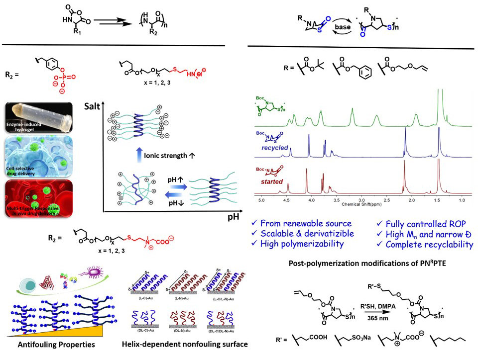 To expand the library of polymers for protein conjugation, we have developed many functional polymers based on amino acids. For example: phosphatase-cleavable poly(phosphotyroine) mimicking an important protein post-translational modification (ACS Macro Lett. 2015; Biomater. Sci. 2017; ACS App. Mater. Interfaces 2017), photo/thermal- and salt/pH- dual responsive polypeptides (Polym. Chem. 2016; Biomacromolecules, 2018), neutral and zwitterionic polypeptides showing helix-dependent nonfouling, adhesion, and cellular internalization behaviors (Biomaterials, 2018; ACS App. Mater. Interfaces 2018; Nano Res. 2019). More recently, we developed hydroxyproline-derived sustainable polythioesters with complete recyclability for the first time (J. Am. Chem. Soc. 2019). Ligations of those functional polymers to proteins are expected to pronouncedly enrich the scope of protein-polymer hybrids and stimulate a broad range of new applications.