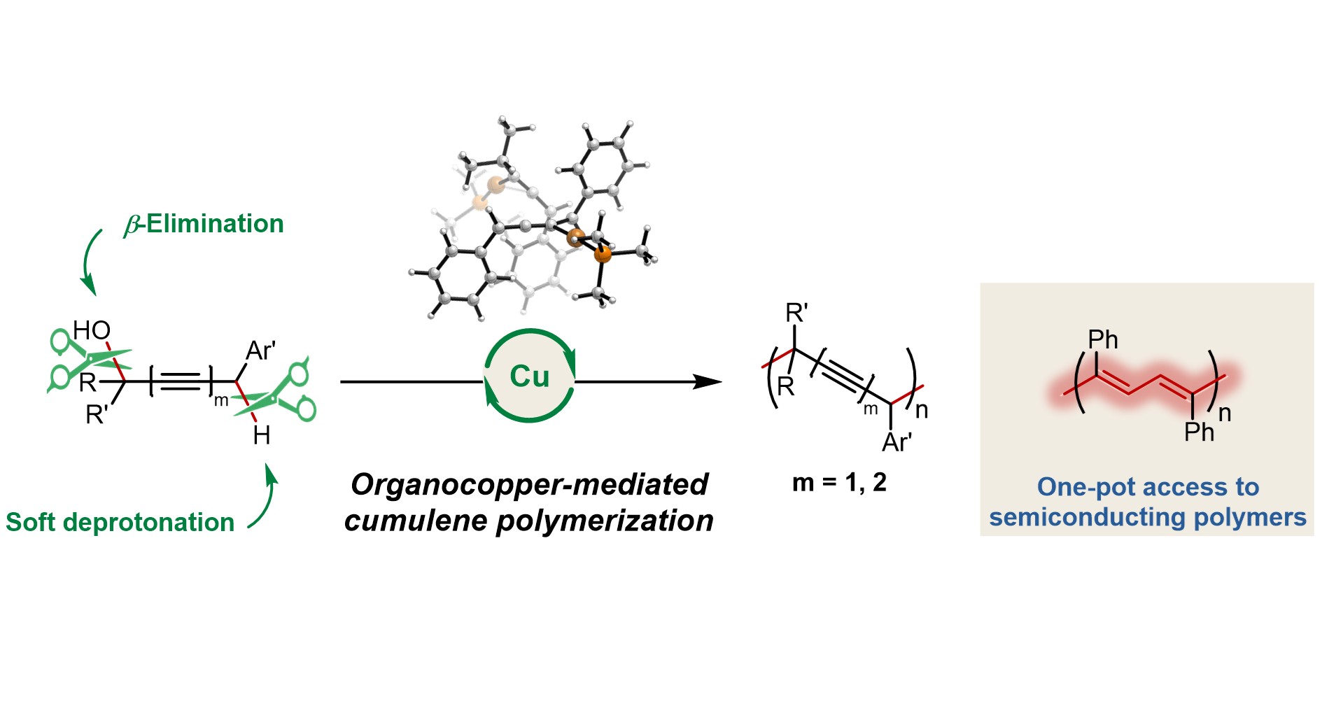 This work involves in situ efficient generation of [n]cumulenes (n = 3, 5) by a soft deprotonation/β-elimination pathway and their subsequent polymerization via organocopper species. Alkyne polymers were produced with high efficiency and onepot synthesis of semiconducting head-to-head poly(phenylacetylene) was demonstrated through a polymerization−isomerization sequence.