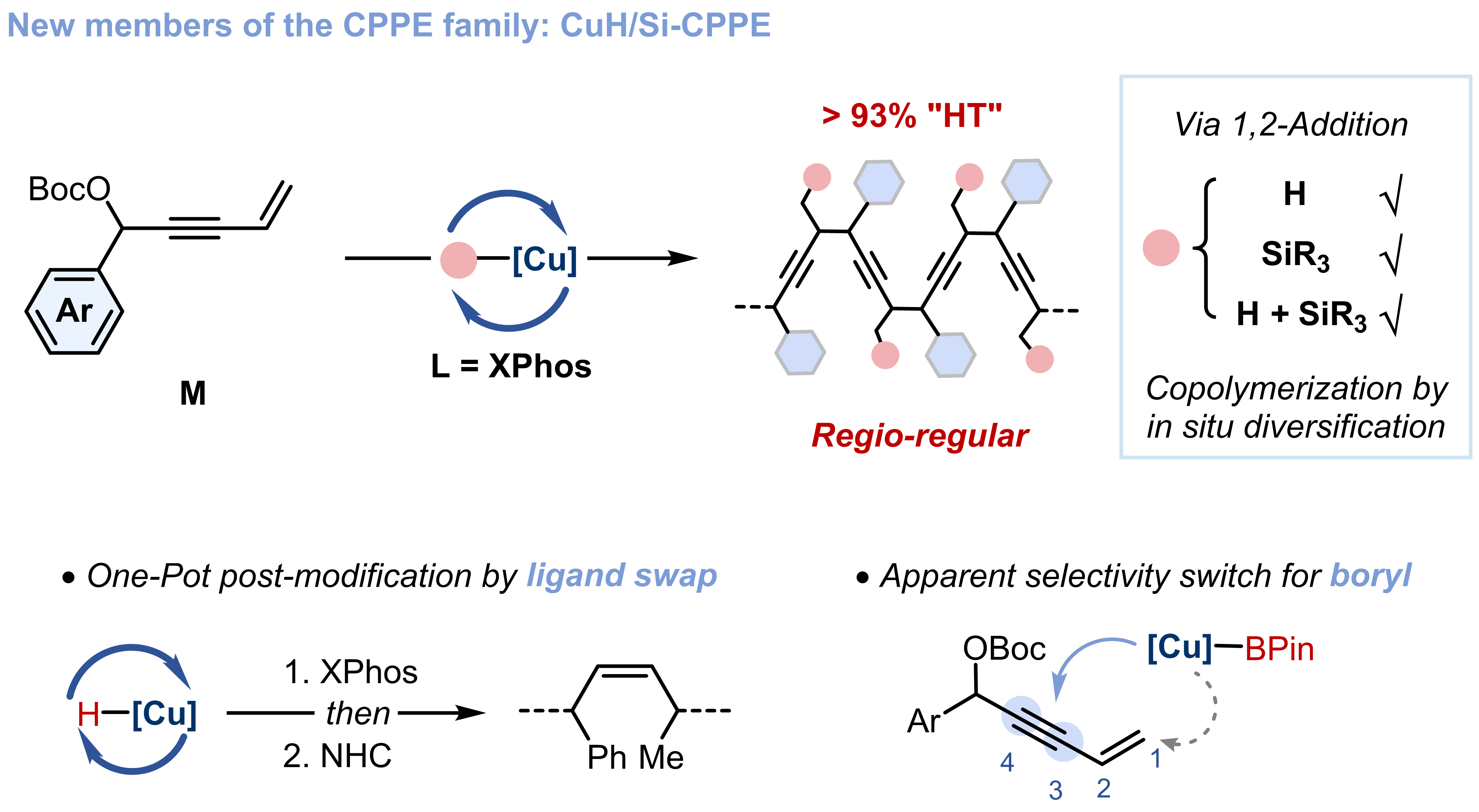 In this work, we reported the CPPE polymerization of conjugated enyne electrophiles catalyzed by Cu-H/Si species, obtaining regioregular (>93% “head-to-tail”) poly(2-butyne-1,4-diyl)s (HT-PBD). We also demonstrated a one-pot copolymerization method to synthesize controllable silicon-containing acetylene polymers, and achieved a one-pot polymerization/semi-reduction synthesis of polymers with cis-poly(butadiene)-derived backbone through ligand swap. Besides, special addition selectivity of copper boron species in this system was found and discussed.