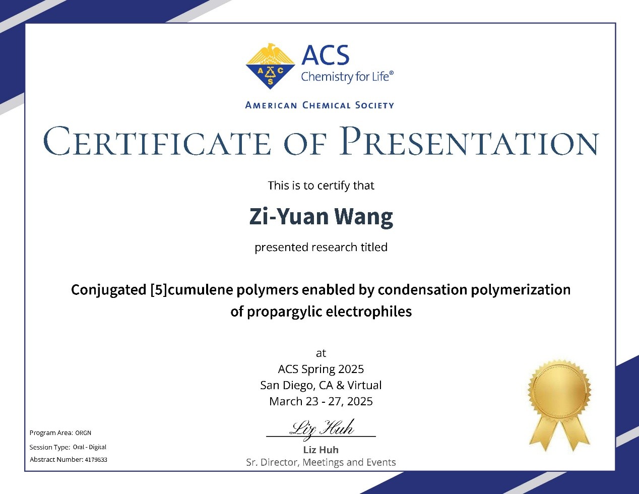 On March 26th, Zi-Yuan showcased his research on conjugated [5]cumulene polymers at ACS Spring 2025. He was awarded the Excellent Report Award in Virtual Graduate Students Symposium in Asia-Pacific Region on Synthetic Chemistry.