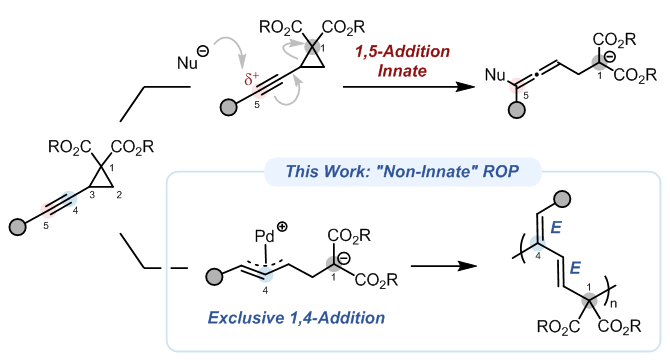 In this work, we report catalyst-controlled, non-innate connectivity in the ROP of alkynylcyclopropane dicarboxylates (ACPs). Leveraging π-propargyl palladium intermediates, we redirect the reactivity from the electronically favored 1,5-addition to a non-innate 1,4-addition pathway, furnishing a conjugated diene-based backbone with high regio- and stereoselectivity. The polymerization can be controlled at low monomer-to-initiator ratios, enabling block copolymer synthesis with well-defined chain ends.