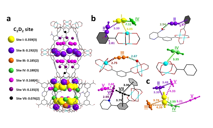 We also investigated the host-guest interaction using in-situ neutron powder diffraction. We discovered the crucial role of divalent copper vacancies and free -NO₂ groups in enhancing the adsorption of C₂H₂. The results showed that C₂D₂ (deuterated acetylene) binds at multiple well-defined sites in the framework, with one particularly strong interaction occurring at the Cu(II) vacancy site.