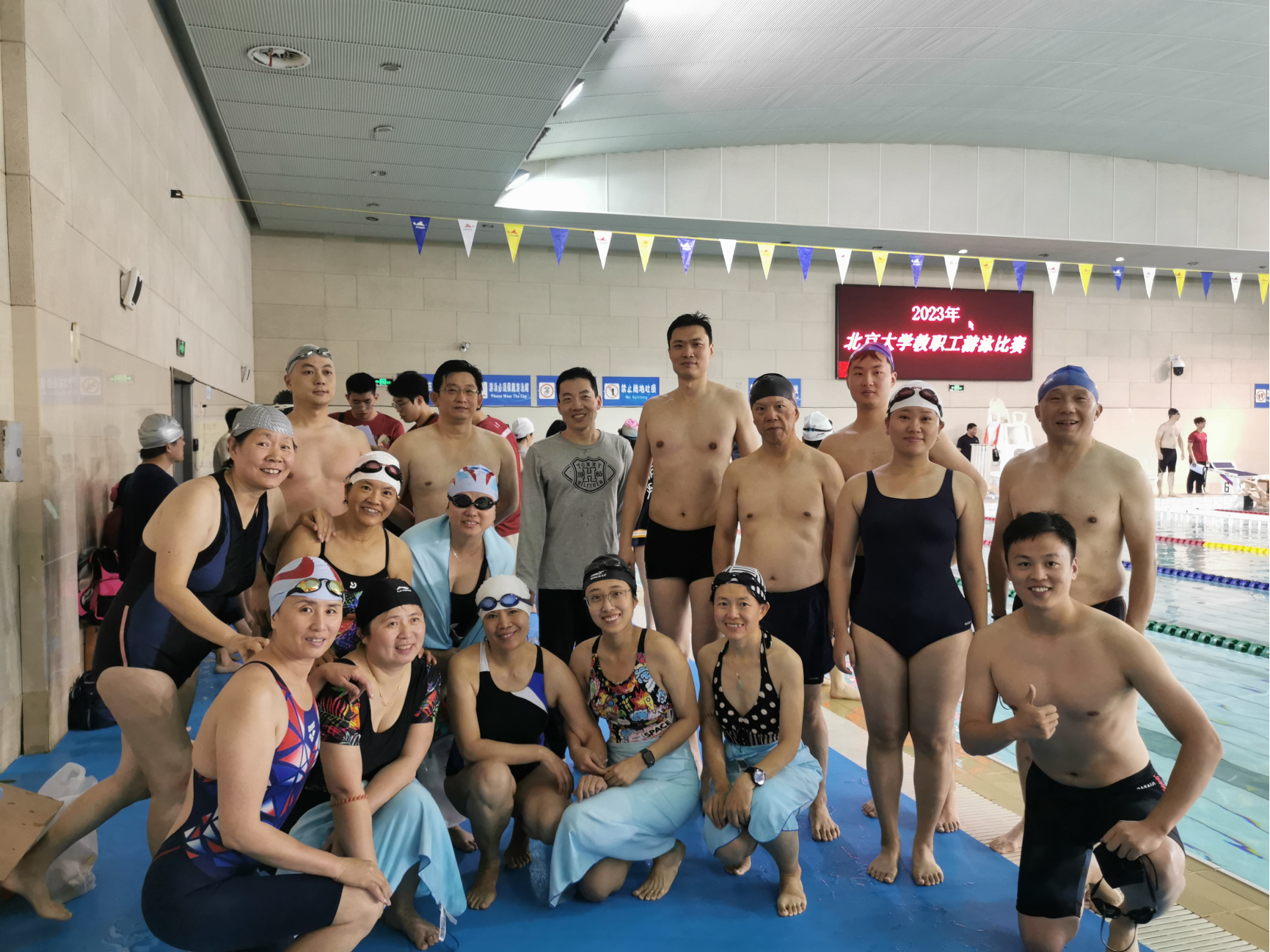 隆冬时节,寒气逼人,但邱德拔体育馆的游泳馆内却气氛热烈,盛况空前。11月29日晚,2023年北京大学教职工游泳比赛在北京大学邱德拔游泳馆内隆重举行。化学学院教工代表队阵容强大,共有25名参赛队员齐聚一堂。经过3个多小时激烈的角逐,化学学院代表队以总分188分的卓越成绩在24支各院系队伍中脱颖而出,荣获第一名。这场比赛不仅为老师们提供了展示泳技的平台,同时也燃起了大家对游泳运动的喜爱与热情。