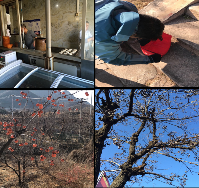 这个季节是柿子成熟的时节,沿途光秃秃的柿子树上挂满了红彤彤的柿子,像是一个个红灯笼,十分诱人,还有小黑枣,甘甜可口。经过长陵村时,途径一家镇子上的美食烧饼夹肉店,小店客人络绎不绝,生意相当红火,这对饥寒交迫的我们来说,绝对是最爱,没有之一。心细的姜老师和杨老师还准备了保温袋,中午达到康陵后也能吃上热乎乎的烧饼夹肉,幸福感简直爆棚。