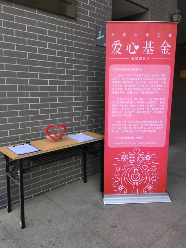 北京大学工会“爱心基金”是学校工会根据中共中央和中华全国总工会的有关文件于2007年设立,旨在推动“送温暖”活动,倡导互助精神,使受惠教职工感受到学校大家庭的关怀和温暖。爱心基金来源于校内外单位赞助、个人捐款及其它合法收入,其中校内单位及教职工个人的捐赠占主要份额。在校工会爱心基金管理委员会的精心组织和认真管理下,基金成立12年来,共计收到捐赠款约420万元,支出善款270余万元,惠及164位教职工及其家属。化学学院工会多年来一直在校工会的领导下积极开展爱心基金的募集,过去两年共计有203人次的化学院师生参与捐款约4万余元。基金成立以来,化学学院有多位教职工因病或突发事故获爱心基金资助,院工会还为部分离世教职工的家属申请了慰问金。虽然每笔善款数额不大,但传递着全校教职工的浓浓关爱之心,使受助人感受到了学校大家庭的温暖。本年度,根据校工会“爱心永在,关爱无限”的倡议和安排,化学学院工会于3月26-28日在学院内组织了爱心基金的年度募捐活动,得到了院内教职员工的积极响应。尽管募捐首日遭遇大风,撕扯了募捐宣传倡议书,但这没有影响人们奉献爱心的行动。最终共计83位教职工参与了捐款活动,募集资金13170元。 “赠人玫瑰,手有余香”,衷心感谢这些奉献爱心的教职工。(名单如下,按姓氏顺序排列)