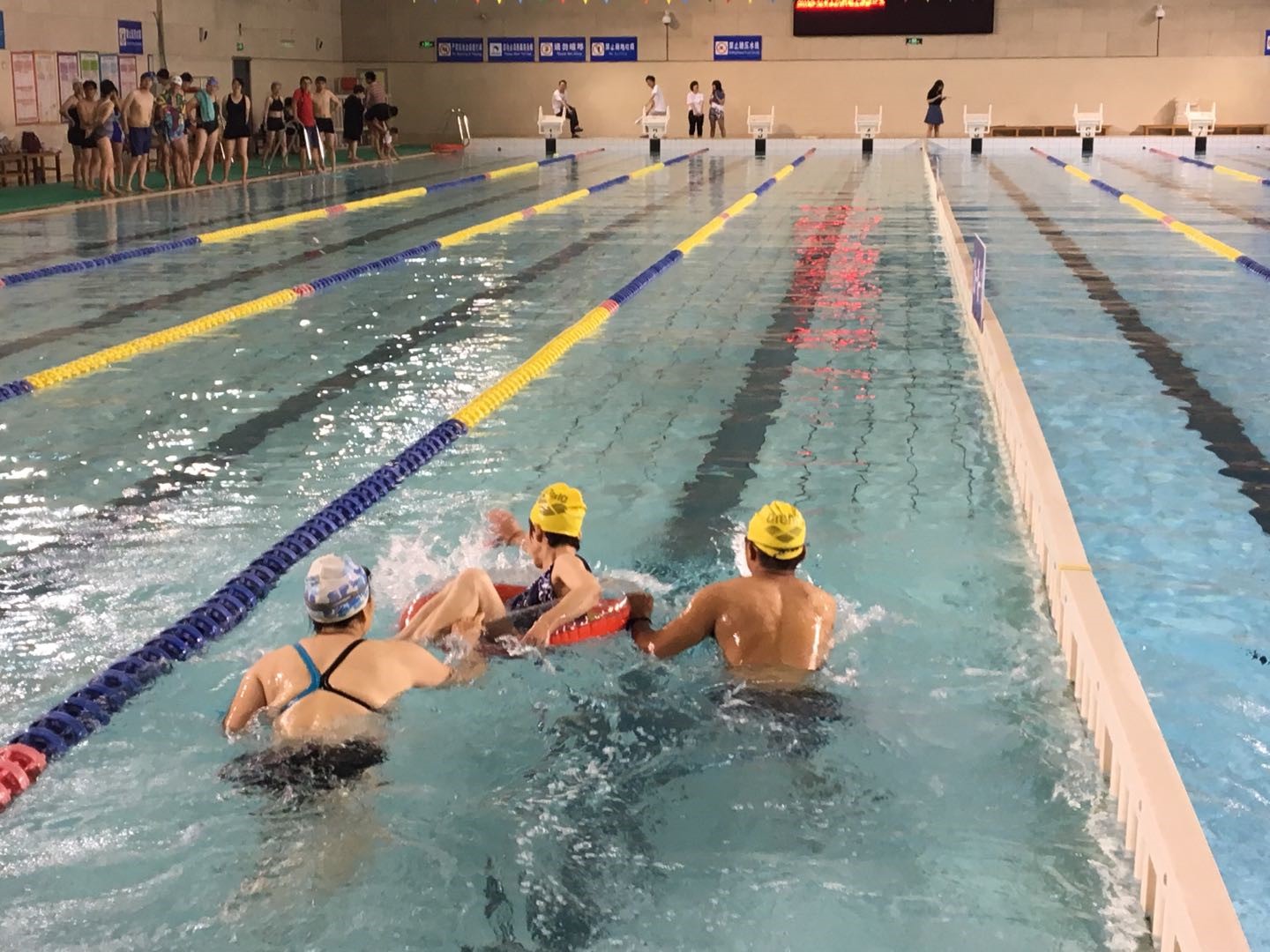 在最后进行的“护花过河”项目中,我院选手一致推选年轻人学习的榜样--段洁菲老师当作鲜花,帅哥宋智凝、成波和美女简蓉、杨展澜甘当护花使者。第一阶段,由简蓉和宋智凝护送段老师从泳池一端到另一端,第二阶段,由杨展澜和成波护送段老师回到出发点,因两位护花使者的手臂不能离开游泳圈,三个人配合起来还是有一定难度。过程中,段老师在游泳圈里也不停的用双手划水,增加了前进的速度。这个项目是今年新增的,大家都没有经验,但在五位队友的通力协作力下,全程100米,我院取得2分36秒13的成绩,在所有参赛队伍中名列第三。在大家的加油呐喊声中,娱乐性的护花过河项目完美收官。