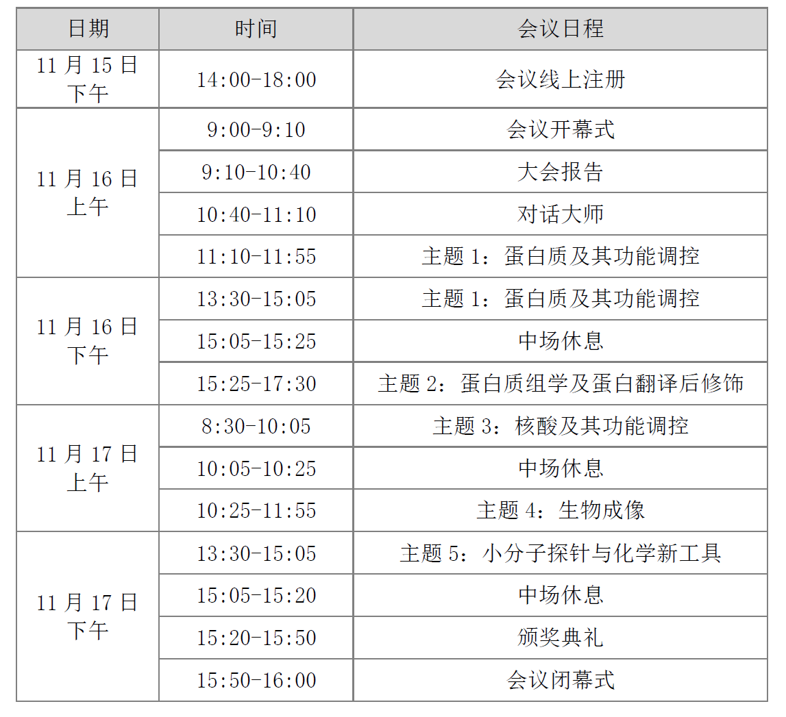 论坛设5个分会主题:蛋白质及其功能调控;蛋白质组学及蛋白翻译后修饰;核酸及其功能调控;生物成像;小分子探针与化学新工具。论坛共组织43个研究生报告,分别以Speech和Flash Talk两种形式进行展示,并设有奖项和奖金。Speech的时长为15分钟,由12分钟成果展示和3分钟讨论交流组成。Flash Talk为5分钟迷你报告,讲述主要研究及成果。