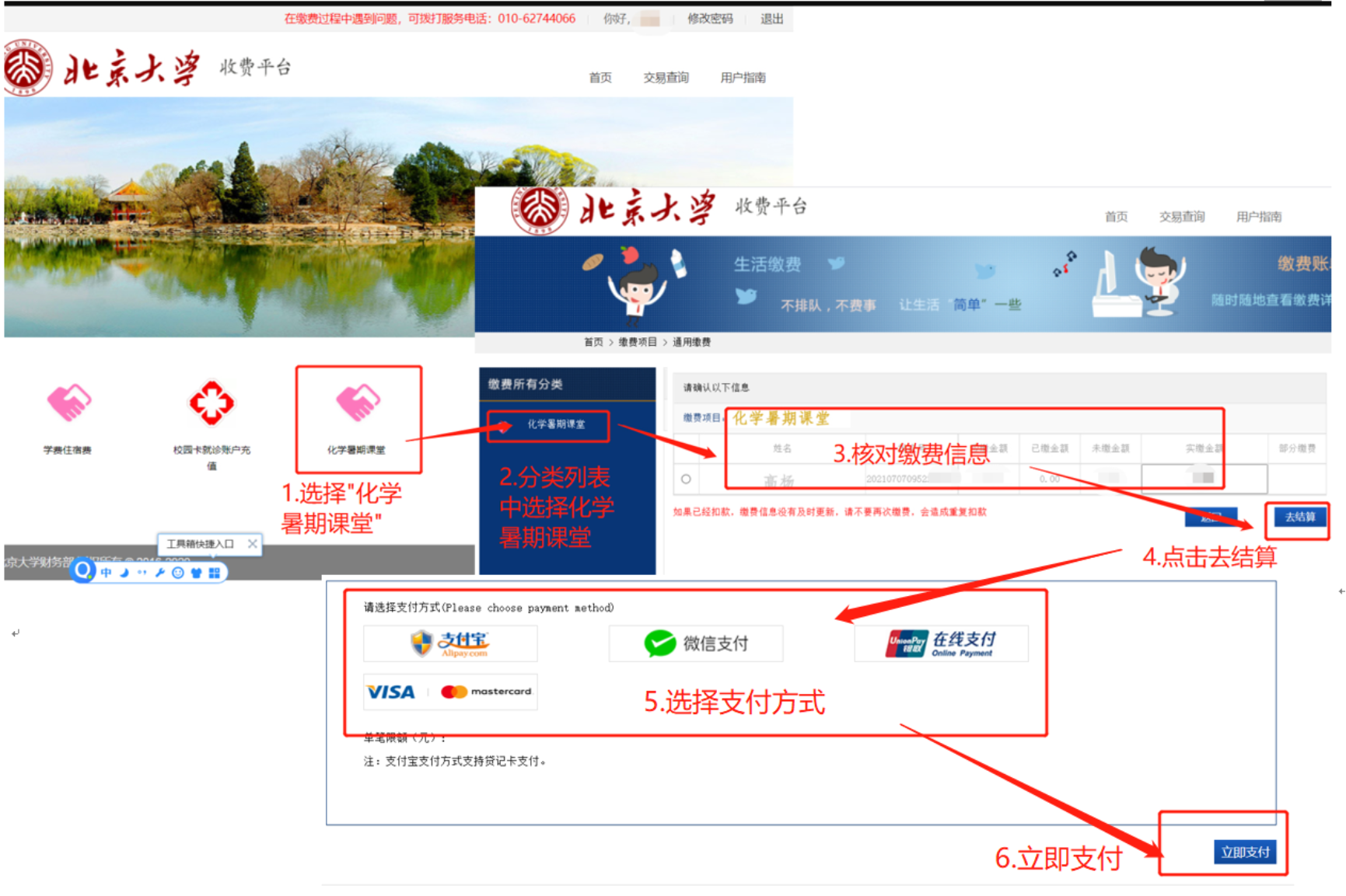 第三步:选择“化学暑期课堂”并确认缴费信息,单击确认支付,选择微信或者支付宝等支付方式后点击立即支付即可。