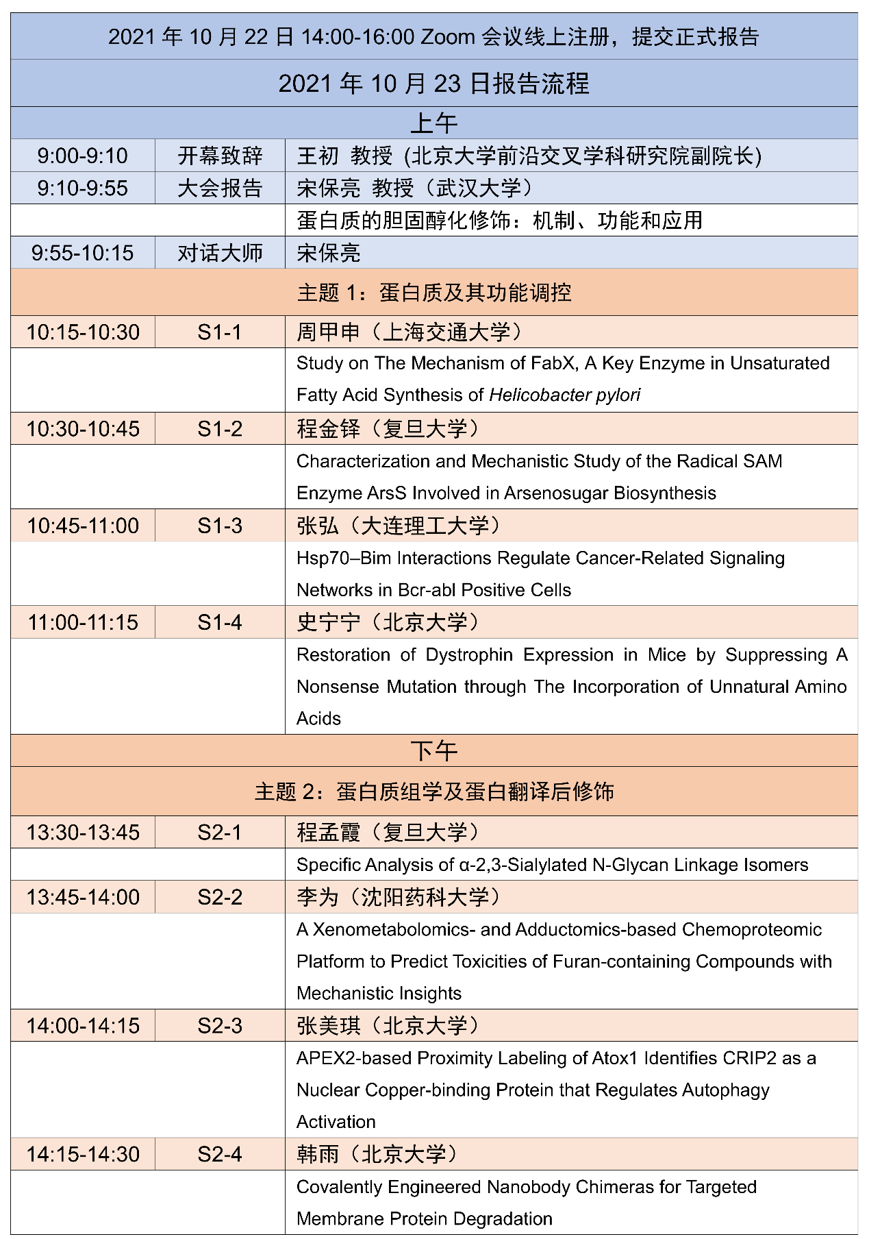 1.本次会议采用ZOOM线上会议交流形式,ZOOM会议线上注册的时间为2021年10月22日14:00-16:00,届时参加Speech报告的31名同学请按时注册登录,进行PPT调试。