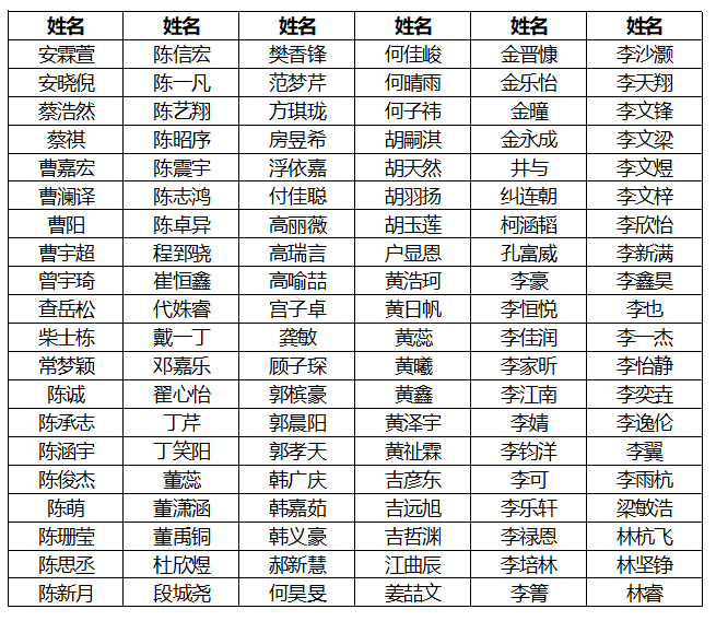 以下是2024年北京大学化学与分子工程学院“全国优秀大学生夏令营”营员的入选名单(按照姓氏首字母排列)。确认参营同学请在规定时间内到北京大学化学与分子工程学院报到!
