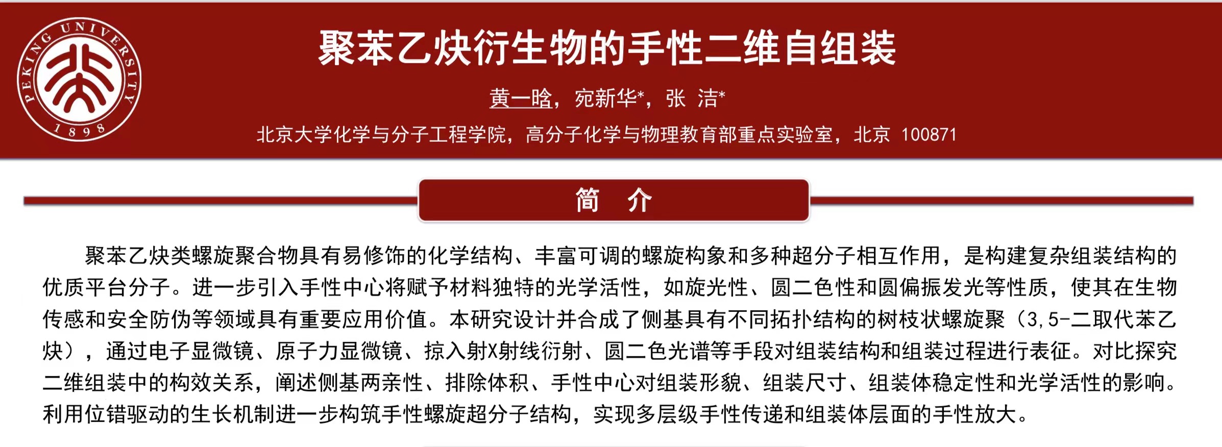 黄一晗同学展示了关于“聚苯乙炔衍生物的手性二维自组装”的研究工作。