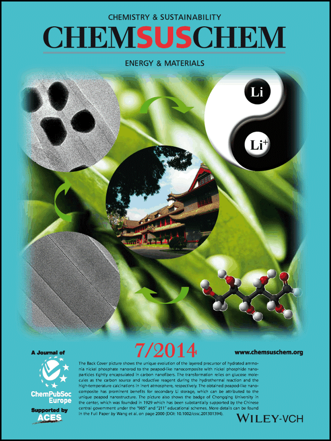 Peapod-Like Composite with Nickel Phosphide Nanoparticles Encapsulated in Carbon Fibers as Enhanced Anode for Li-Ion Batteries, H.J. Zhang, Y.Y. Feng, Y. Zhang, L. Fang, W.X. Li, Q. Liu, K. Wu, Y. Wang, ChemSusChem2014, 7, 2000. (Inside Cover)