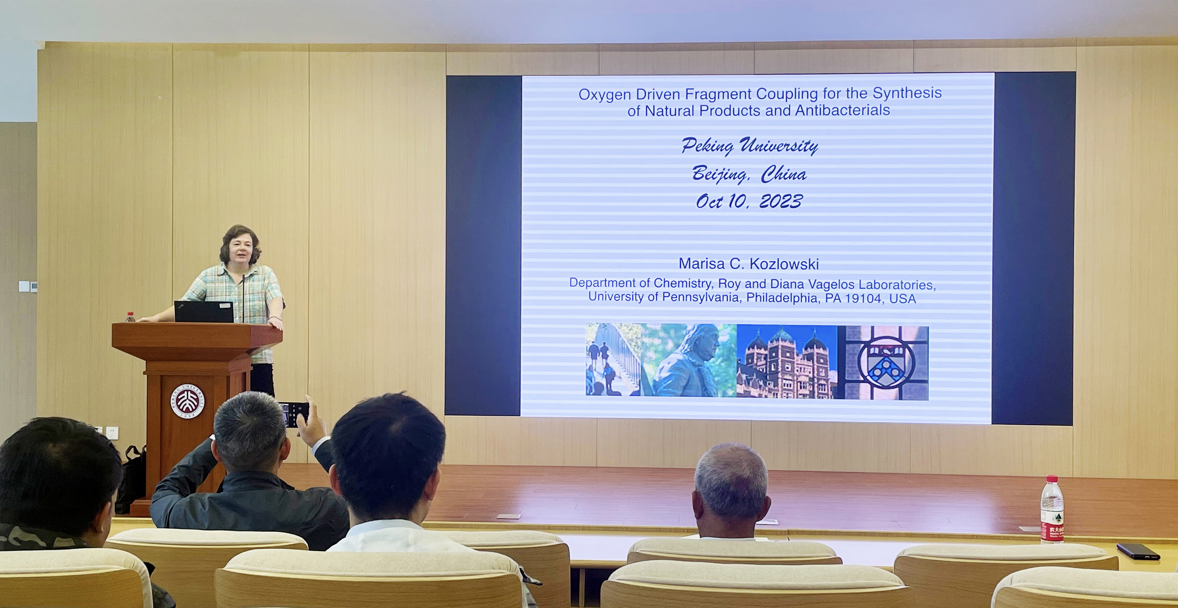On Oct 11th, Prof. Marisa Kozlowski from the University of Pennsylvania in the United States visited Peking University, upon the invitation of Prof. Xi and Prof. Zhang. In the CB101 meeting room, she delivered an outstanding academic presentation to us. Prof. Marisa Kozlowski received her Ph.D. from the University of California, Berkeley in 1994. From 1995 to 1997, she conducted research in asymmetric catalysis in the laboratory of Prof. David A. Evans at Harvard University. She currently holds the position of Professor of Chemistry at the University of Pennsylvania and has been serving as the Editor-In-Chief of the famous chemistry journal, 'Organic Letters,' since 2021. Her primary research focus is on developing new organic synthesis methods and catalyst design.