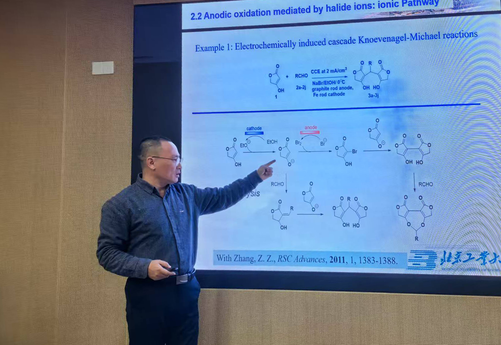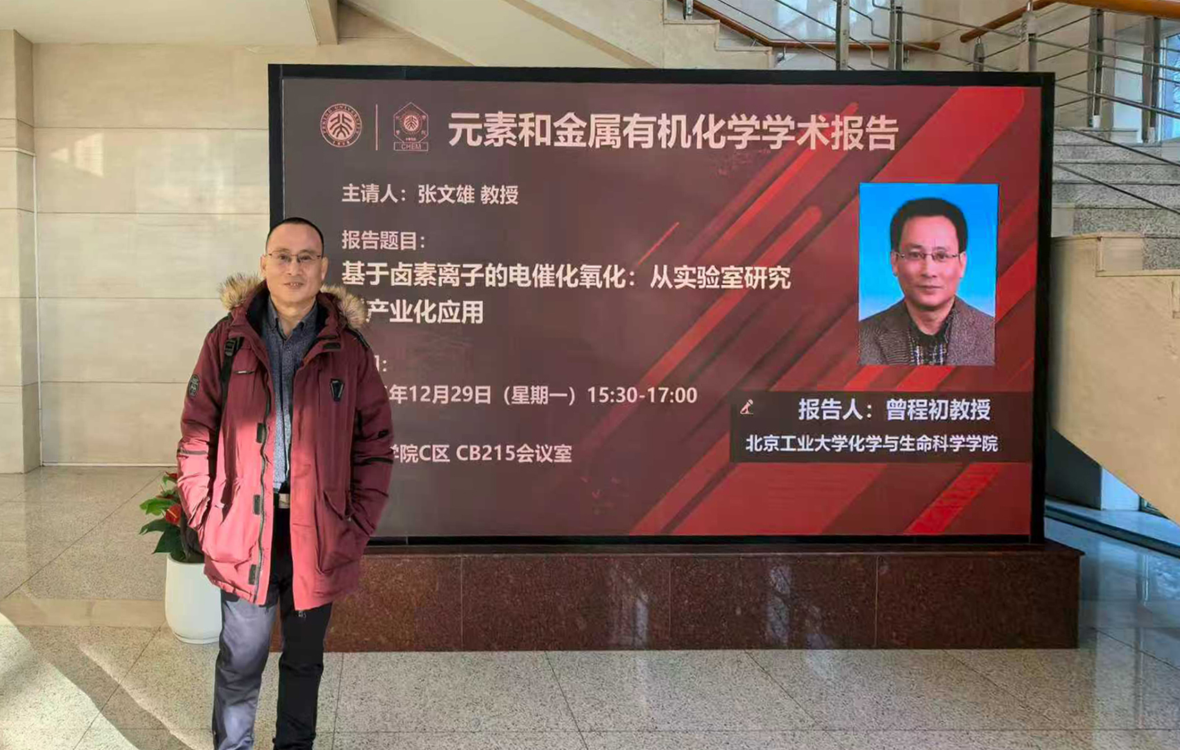 On December 29th, Prof. Zeng Chengchu from Beijing University of Technology, invited by Prof. Zhang, delivered an academic lecture at Peking University. Prof. Zeng's research mainly focuses on green electrochemical synthesis methods, technologies, and industrial applications of functional organic molecules, with several of his scientific achievements already applied in industrial production. In his lecture, he emphasized how to extend electrocatalytic oxidation from laboratory research to industrial applications, inspiring us to view research topics from a fresh perspective and think about how to transform scientific research into industrial applications. We would like to thank Prof. Zeng for his visit!