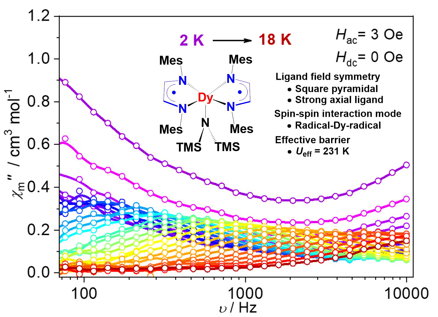 A new kind of diradical rare-earth metal complexes supported by diazabutadiene (DAD) ligands [(DAD)2LnN(TMS)2] (1, Ln = Dy, Lu) were synthesized and studied. They showed a new [radical-Ln-radical] alignment with distorted square pyramidal geometry. Structural and DFT analysis illustrated the radical anionic nature of the ligands. Magnetic studies revealed the antiferromagnetic coupling of the two radicals in 1-Lu. 1-Dy showed the typical single-molecule magnet (SMM) behavior with the effective energy barrier of 231 K, which is much higher than similar radical-containing SMMs. Magneto-structural analysis suggests that the anionic [N(TMS)2]- group plays the vital role for the SMM property. This study provides a new platform for further improving the performance of radical-lanthanide SMMs.
