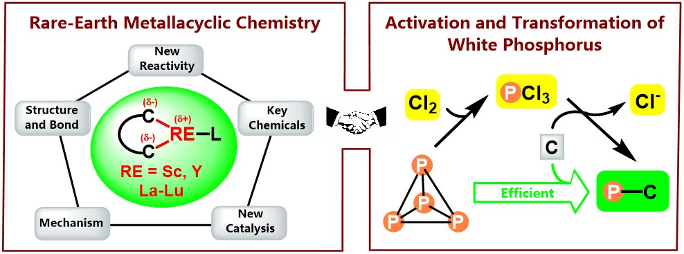 Our group adheres to the philosophy of “Synthetic Chemistry Based on Mechanism and Organometallic Reactive Intermediates”. The research focuses on the realm of rare-earth metallacyclic chemistry, the design and application of rare-earth photocatalysts, and the activation and transformation of white phosphorus. At the intersection of inorganic and organic chemistry, we seek convergence points for research, with a particular focus on exploring fundamental scientific questions in phosphorus chemistry, phosphorus chemical industry and the application of rare-earth organometallics. Our research interests span organometallic chemistry, elemento-organic chemistry, computational chemistry, machine learning driven by synthetic chemistry of organometallics and elemento-organic compounds, coordination chemistry, and crystallography. Balancing both foundational and applied aspects, our group places emphasis not only on fostering students’ research capabilities, but also on the holistic development of their personalities.