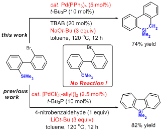 许多化合物中含有三烷基硅取代基,如SiMe3。因此,烷基Si-C(sp3) 键和silyl C(sp3)-H键都是常见的化学键。实现过渡金属催化的选择性切断该类化学键,从化学反应机理研究和合成应用研究都具有重要意义。当碳杂环中的一个或多个碳原子被硅原子取代后,生成的硅杂环将具有不同的性质。但是,由于硅杂环的合成方法很少,其性质研究受到很大限制。我们利用钯配合物为催化剂,通过选择性切断Si-C(sp3)键和进一步的分子内Si-C(sp2)偶联,合成了一类结构新颖的苯并噻咯吲哚杂环化合物 (Y. Liang, S. Zhang and Z. Xi*, J. Am. Chem. Soc. 2011, 133, 9204-9207)。进一步地,当我们改变反应条件时,选择性地切断了silyl C(sp3)-H键(如下图)。反应机理特别是碱的作用还在进一步研究中。本工作是金属催化切断silyl C(sp3)-H键的首例。同时,通过该反应,可以合成硅杂环化合物如硅杂六元环,为进一步地研究硅杂六元环的反应和应用提供了条件。