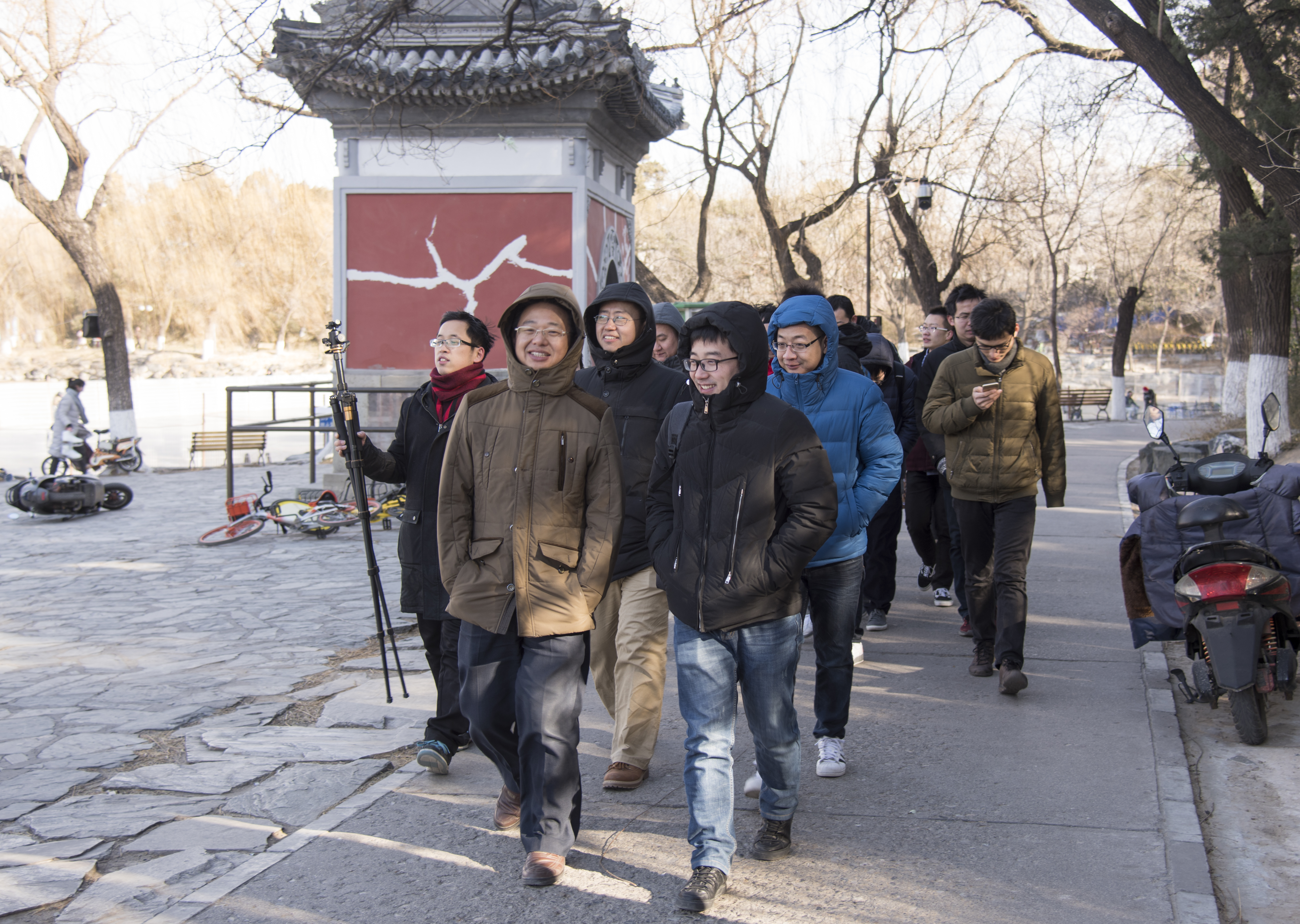 下午1点半,研究室的老师和同学们欢聚于图书馆前合影留念,开始了新年活动的行程。冬日的校园别有一番景致,少了些许喧嚣,多了几分宁静。虽然北风凛冽,但是大家漫步在午后的阳光中,谈天说地,欢笑中充满着对新一年的美好向往。未名湖畔、校友门外,我们留下了一张张精彩的合影。