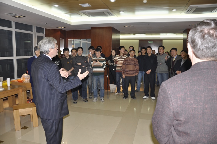 2010年1月19日晚,法国雷恩(Rennes)大学的Pierre Dixneuf教授在北大化学院A917成功举办了一个特别的聚会。“Dixneuf”在法语中是“十九”的意思,因此每年的1月19日Dixneuf教授都要办一个聚会,邀请雷恩大学的老师和学生参加。与往年不同的是,今年Prof. Dixneuf的聚会首次在中国举办,主题是庆祝十年来雷恩大学金属有机与催化实验室与国内各高校和研究所之间的交流与合作。参加这次聚会的除了有北大、清华、人大、上海交通大学,武汉大学等高校的老师和同学,还有法国驻华大使馆科技合作处的工作人员以及雷恩大学化学院国际硕士班的几位中国毕业生。为了让大家品尝到地道的法国美食,Dixneuf教授特地从法国带来很多特色食物和各种美酒。这次的活动不仅增进了大家之间的交流和沟通,也让大家对法国文化有了进一步的了解。
