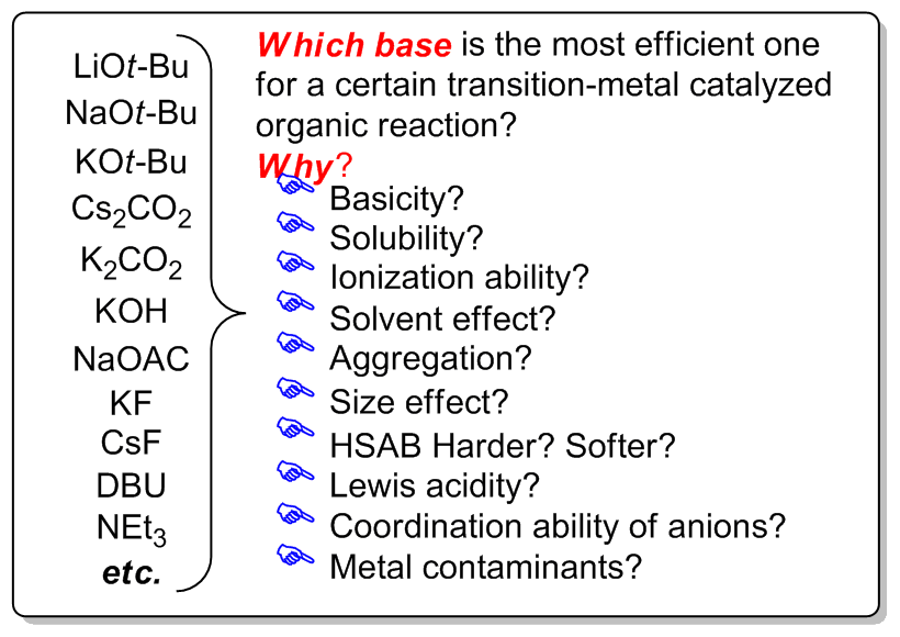 Bases, either organic bases or inorganic ones, are very often added in transition-metal catalyzed organic reactions to promote the catalytic reaction efficiency and increase the yields of products. As a common practice for most published papers, a reaction condition screening table is given, listing a number of bases and the respective yield of products. However, no discussion or a little in some cases is provided on why one base works well to give a high yield formation of the product, but other bases afford no or low yields of the product. Furthermore, in many cases a certain base works well for one reaction but may not work for another. Indeed, for a complicated reaction mixture containing several different components, it is very difficult to analyze and understand the roles of certain bases. Yet there are sporadic discussions and rationalization on the roles of bases in the literature. The role of bases has been reported to be straightforward in some cases, for examples, to abstract protons or to neutralize acids in the reaction system, but very complicated in many other cases. The roles of bases may be affected by several factors, including basicity, solubility, ionization ability, solvent, aggregation state, the size of the metal cations, Lewis acidity of the metal cations, the HSAB theory, the size of the counter anions; the coordination ability of the counter anions, etc. In addition to abstract protons or to neutralize acids in the reaction system, a base may activate the catalysts and facilitate the regeneration of reactive catalytic species. The roles of the metal cation in a base may mainly influence the solubility of the base in organic solvents, or interact with substrates or solvents. The roles of the counter anion in a base may mainly contribute to the coordination with a metal center and subsequent stabilize the complex. The major differences between inorganic bases and organic bases include their solubility and bulkiness. Metal contaminants in bases may also have innegligible effect on the reactions, since in many cases a large excess amount of bases are added. This review is written based on the limited knowledge, focusing on commonly used inorganic bases such as LiOt-Bu, NaOt-Bu, KOt-Bu, LiOAc, NaOAc, KOAc, LiOH, NaOH, KOH, Li2CO3, Na2CO3, K2CO3, Cs2CO3, KF, CsF and organic bases such as DBU and Et3N.