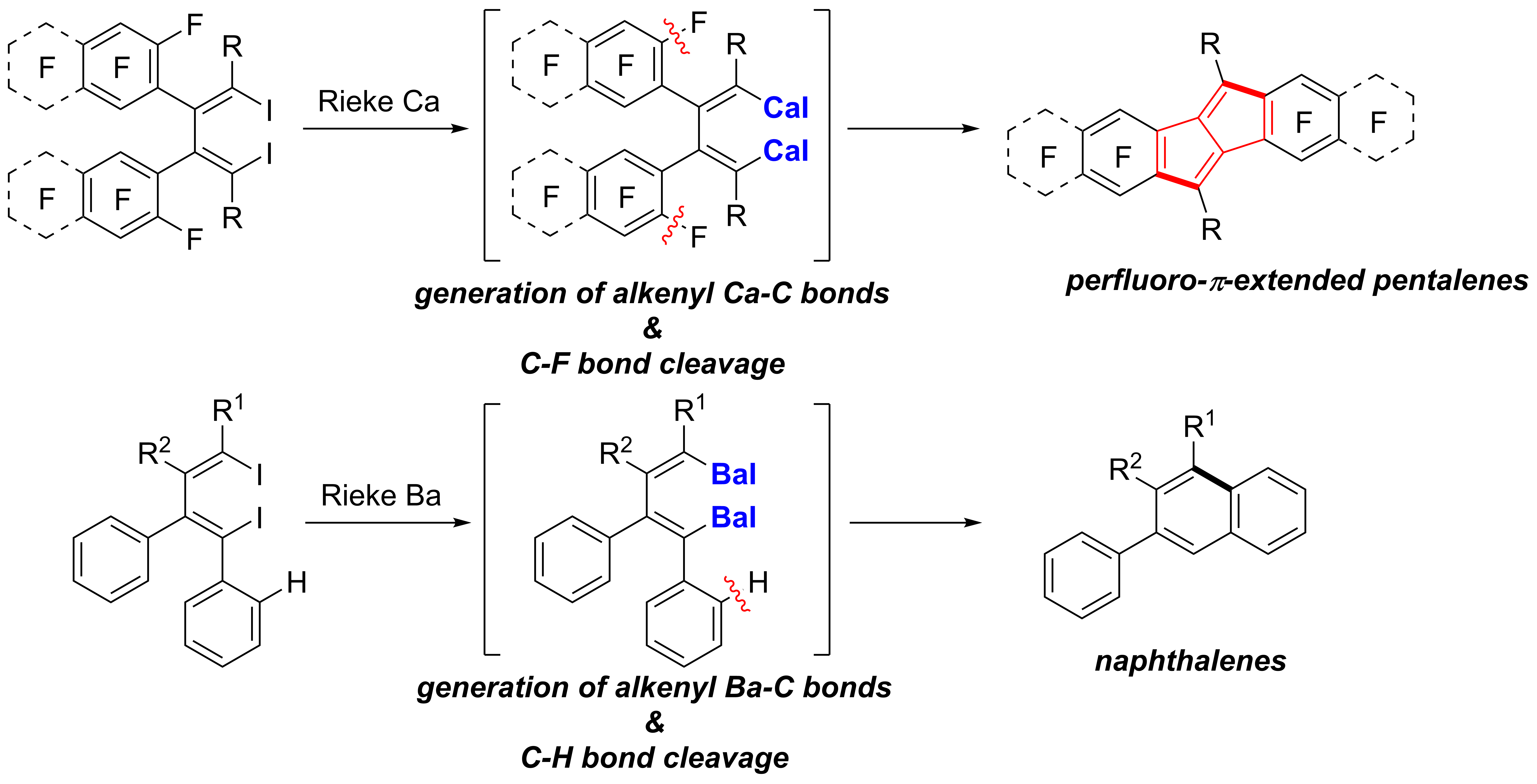 金属有机试剂如格氏试剂(RMgX)极大地推动了合成化学及相关学科的发展。因此,新型金属有机合成试剂的研究一直是学术界和工业界关注的焦点之一。本研究室自成立以来的主要研究方向集中在双锂试剂化学研究方面。在此基础上,我们希望坚持自己的研究特色和研究思路,进一步发现和发展其它有用的金属有机合成试剂。镁、钙、锶、钡属于元素周期表中第二主族(也称碱土金属)。与有机镁试剂(如格氏试剂)的广泛应用相比,钙、锶、钡的金属有机化合物(含有碳-金属键)的研究很少。其主要原因包括钙、锶、钡金属的高度稳定性以及与其相对应的金属-碳键的极高活性(高度不稳定性)。换句话说,不但这些金属有机化合物的合成相当不易,一旦形成之后其反应的选择性也不容易控制。但是,这些金属有机合成试剂必然有其独特的性质和应用。因此,近年来本研究室将重碱土金属(钙、锶、钡)有机化学作为主要研究方向之一。2013年,我们报道了有关金属的配合物合成(李恒等,欧洲化学, 2013, 19, 12859),以及首例戊搭烯钡金属有机化合物(李恒等,德国应用化学, 2013, 52, 10822。封面文章)。本工作中,我们尝试首先形成烯基-金属活性中间体,之后进一步应用该活性中间体。烯基-重碱土金属(钙、锶、钡)键的形成几乎没有任何文献报道。我们在双锂试剂研究的基础上,首次实现了该类化学键的形成。我们利用这些原位生成的高活性中间体,使其与含有C-F键的取代基发生分子内反应,合成了其他方法不能够合成的多氟戊搭烯衍生物。戊搭烯衍生物为一类反芳香性化合物,作为有机共轭材料近年来受到极大关注。而氟代的戊搭烯衍生物由于氟元素的独特性质将具有独特的材料性能,但是其合成在此之前没有其他方法可以实现。我们通过与裴坚教授课题组(王小野同学)合作,研究了这些化合物作为共轭体系有机材料的性质,获得了迄今为止所有戊搭烯衍生物中具有最低LUMO能级(−3.56 eV)的分子。