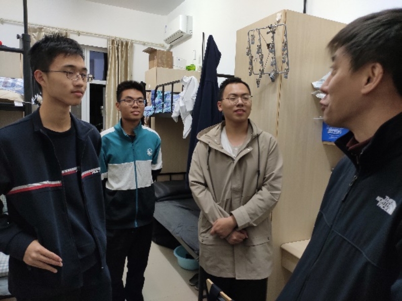 在2020级学生宿舍,年级主任王初与同学深入交流,嘱咐同学们保持宿舍整洁通风,做好个人卫生。了解同学们入学以来学生生活适应情况提醒同学遇到任何困难要及时与班主任、辅导员联系,学院将为每位同学的健康成长做好支持保障。