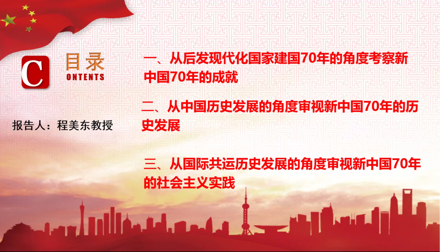 程美东从三个大历史的角度审视了新中国70年的历史发展:一是从后发现代化国家建国70年的角度考察新中国70年的成就;二是从中国历史上重要王朝建立70年的角度考察新中国70年的发展;三是从国际共产主义运动历史发展的角度审视新中国70年的社会主义实践。他说,新中国70年的发展是社会主义道路在落后国家成功发展的典型,它丰富了社会主义的理论和实践,使得社会主义制度大放异彩,提升了人们对社会主义活力的认识。