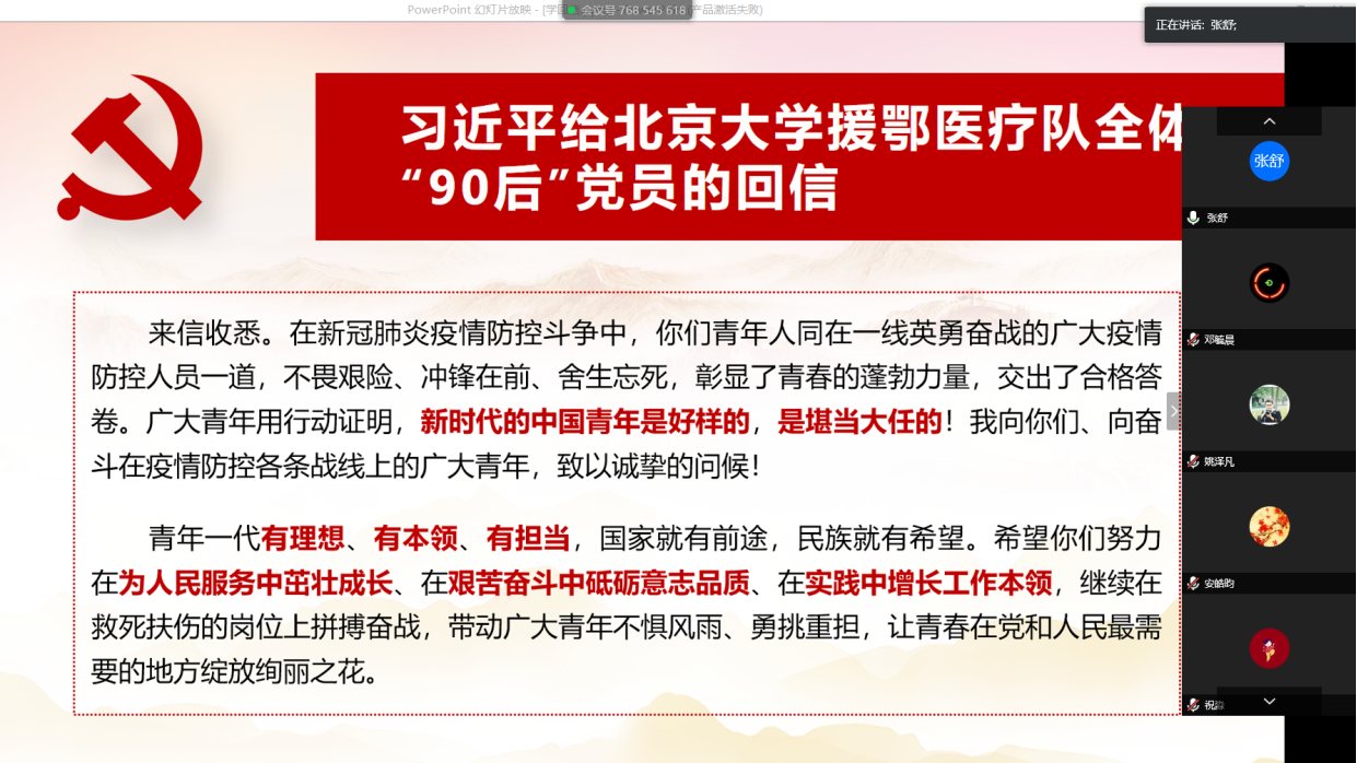 3月23日中午,化学与分子工程学院团委组织各年级团支书,团委学生骨干,学生会及研究生会主席团、常代表,挂靠社团负责人通过视频会议的形式,学习了习近平总书记给北京大学援鄂医疗队全体“90后”党员的回信。团委书记张舒,辅导员李珣、高琰参与会议,40余名团学骨干参加会议。会议由李珣主持。