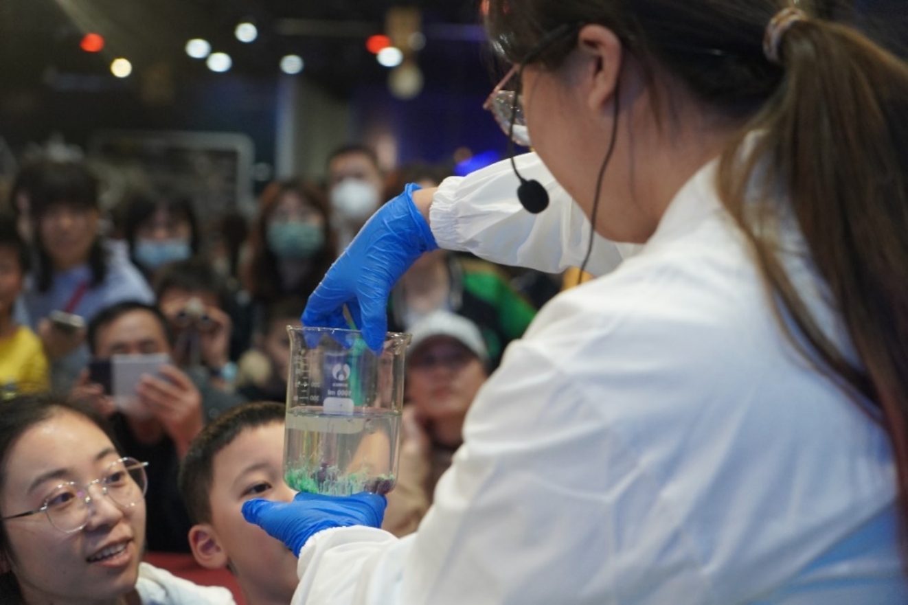 这一系列有趣的小实验,极大地提升了科技馆的观众们对化学世界的好奇与探索欲。每场活动进行时,展台前都挤满了一个个满脸写着好奇的小脑袋,不时听到稚嫩的提问声,“这是为什么呀?”“怎么会变色呢?”“水到哪里去了”。面对实验中的奇特现象和志愿者们抛出的问题,小朋友们也争先恐后地举手发言,大家一起在寓学于乐的过程中了解了表象背后的科学本质。现场陪同的家长们也纷纷表示这样的活动很有意义,让孩子和家长都直观、具体、清晰地感受到了化学之美。