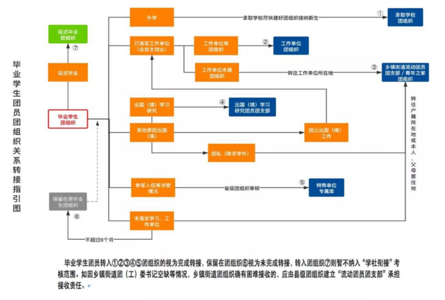 因公出国(境)工作的毕业学生团员,在出国(境)前将其团组织关系转接至派出单位的团组织;因私出国(境)的毕业学生团员(求学除外),在出国(境)前将其团组织关系转接至户籍所在地或本人、父母居住地的乡镇街道团组织。