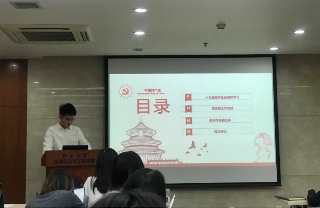 2019年11月22日,北京大学化学与分子工程学院18级研究生第一党支部“不忘初心、牢记使命”主题教育专题组织生活会暨十九届四中全会精神学习会在化学学院A717会议室顺利召开,全体支部成员参与了此次会议,会议由支部书记李昊主持。