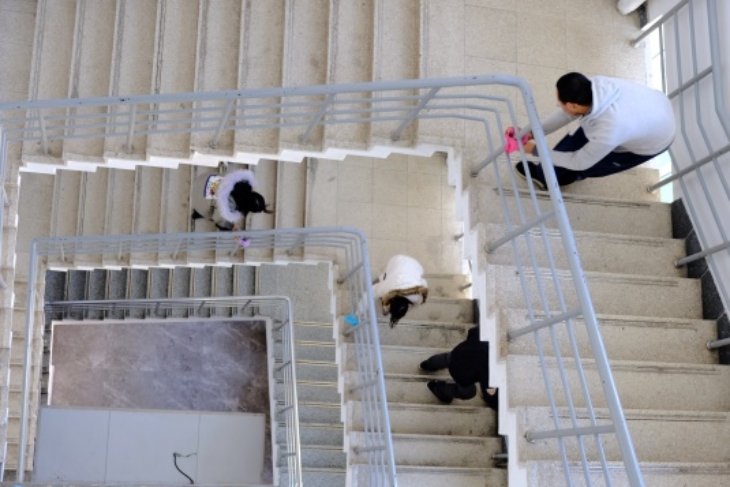 图2:支部同学团结协作擦拭化学楼B区扶手