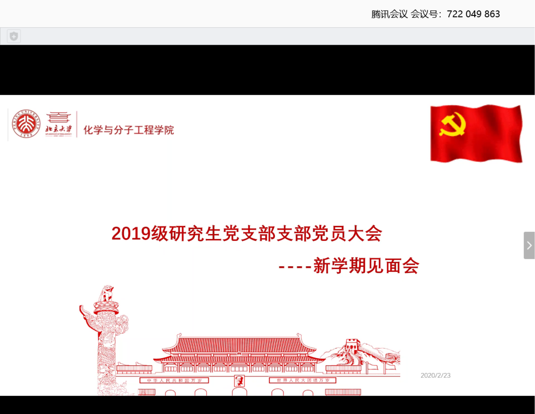 为了传达习近平总书记在中央政治局常委会会议研究应对新型冠状病毒肺炎疫情工作时的讲话精神,了解支部成员居家学习科研的状态,布置新学期工作,化学与分子工程学院2019级研究生党支部于2月23日在腾讯会议平台以视频会议的方式召开了线上支部大会,党支部27名党员全部参加。会议由党支书詹佶睿主持。