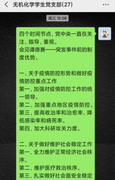 最后,赵自然同志对会议进行了总结,鼓励大家发挥党员的带头作用,积极响应国家号召,配合学校和地方政府的防控工作,宣传防控知识,同时不造谣、不信谣、不传谣。另外提醒大家每日登陆校内门户,填写当日身体状况。