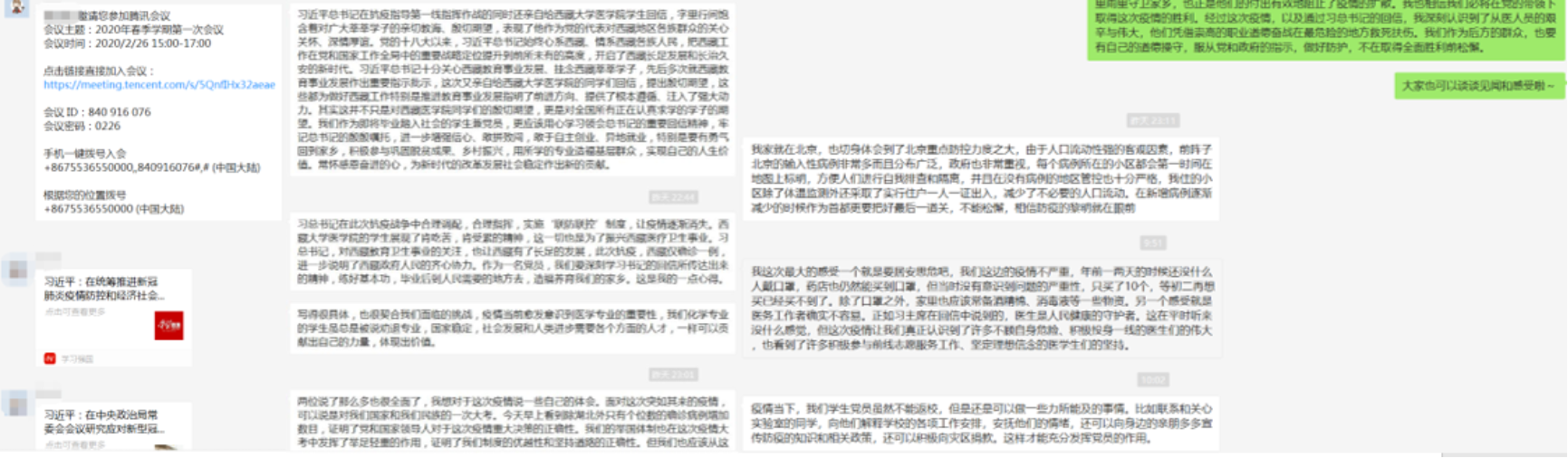 在当前防疫抗疫背景下,为充分发挥党支部和党员的战斗作用、加强党员理论学习,化学学院无机化学学生党支部于2020年2月26日召开了一次特殊的线上见面会。下午三点,全体党员准时进入网络会议间,利用腾讯会议软件进行线上会议。会议围绕《习近平在中央政治局常委会会议研究应对新型冠状肺炎疫情工作时的讲话》和《习近平给在首钢医院实习的西藏大学医学院学生的回信》(以下简称《讲话》和《回信》)学习和讨论。会议由党支部书记赵自然主持。