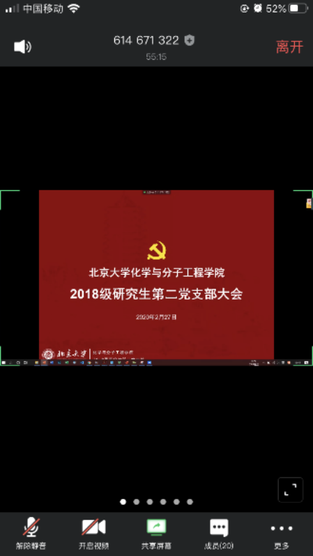 2020年2月27日晚7时,化学与分子工程学院2018级研究生第二党支部在线上开展了2020年第一次支部大会,支部全体21名成员参与了本次会议,会议由党支部书记张攀主持。