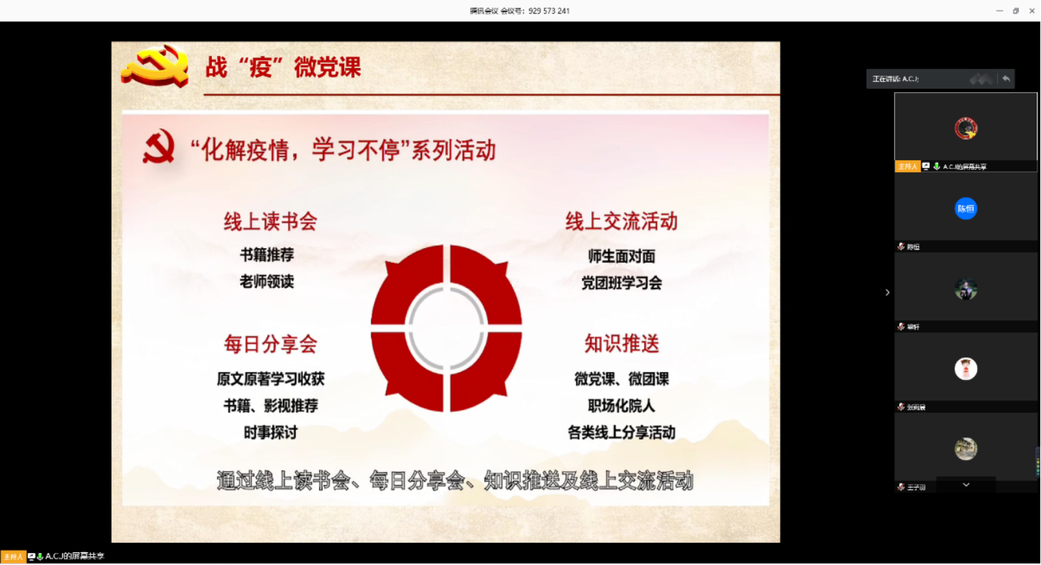 最后,詹佶睿向各位党员在一对一通知工作中的付出表示感谢,向支部党员们介绍了创新立项的五项工作开展计划,并强调了疫情期间应加强党员与积极分子之间的线上沟通。