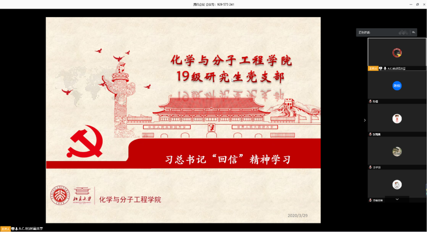 3月29日下午3点,化学与分子工程学院2019级研究生党支部通过腾讯会议召开了2020年春季学期第二次线上支部大会----习总书记“回信”精神学习,支部49名党员和积极分子参加本次会议。会议由党支部书记詹佶睿主持。