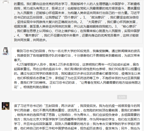 近日,习近平总书记给北京大学援鄂医疗队全体“90后”党员回信,在北大师生间引起强烈反响。为了学习领会此次回信的精神,化学与分子工程学院无机化学学生党支部于2020年3月26日下午三点在腾讯会议平台上召开线上学习会。会议围绕《习近平给北京大学援鄂医疗队全体“90后”党员的回信》(简称《回信》),结合习近平总书记给北大的“五封回信,两次讲话”为重要内容开展。会议由党支部书记赵自然主持。