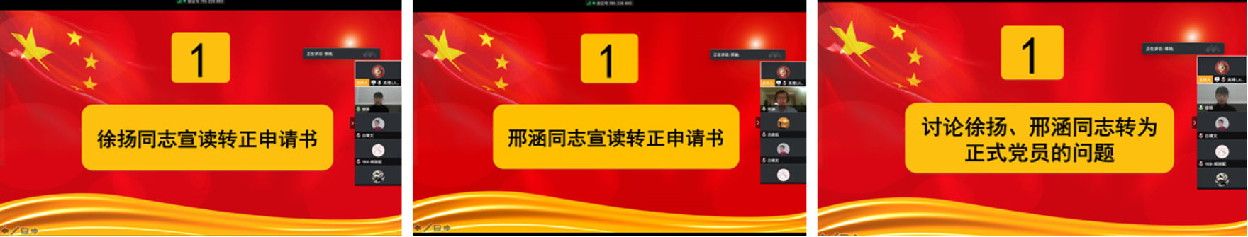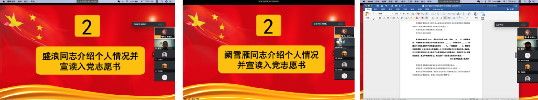 在线上镜头前,徐扬、邢涵同志两位同学位同学先后向到场所有党员宣读了自己的转正申请书,介绍了自己在过去一年预备期过程中学习、生活、科研工作等各方面的情况,也分别指出了自己存在的一些不足。徐扬同学结合在过去的一年中参与国庆70周年群众游行和“新冠”疫情期间参与志愿服务的经历,介绍了自己对党认识和理解。邢涵同学则从党的理论知识学习的角度谈及自己阅读《毛泽东选集》的感受,强调了要努力将自己所学的理论与实践结合,为身边的同学提供力所能及的帮助。之后两位同志的入党介绍人就两位同学在党的理论知识学习、科研工作开展、日常生活等方面陈述了自己的意见,均表示推荐两位预备党员按时转为正式党员。随后,本支部到会的27名正式党员对两位同学转为正式党员进行投票,支部书记高博、宣传委员程熠监票、组织委员彭洁计票,会议通过三位同学转为正式党员的申请。宣读完大会决议后,两位同学均表示在之后的日子里要更加严格的要求自己,努力成为一名优秀的共产党员。
