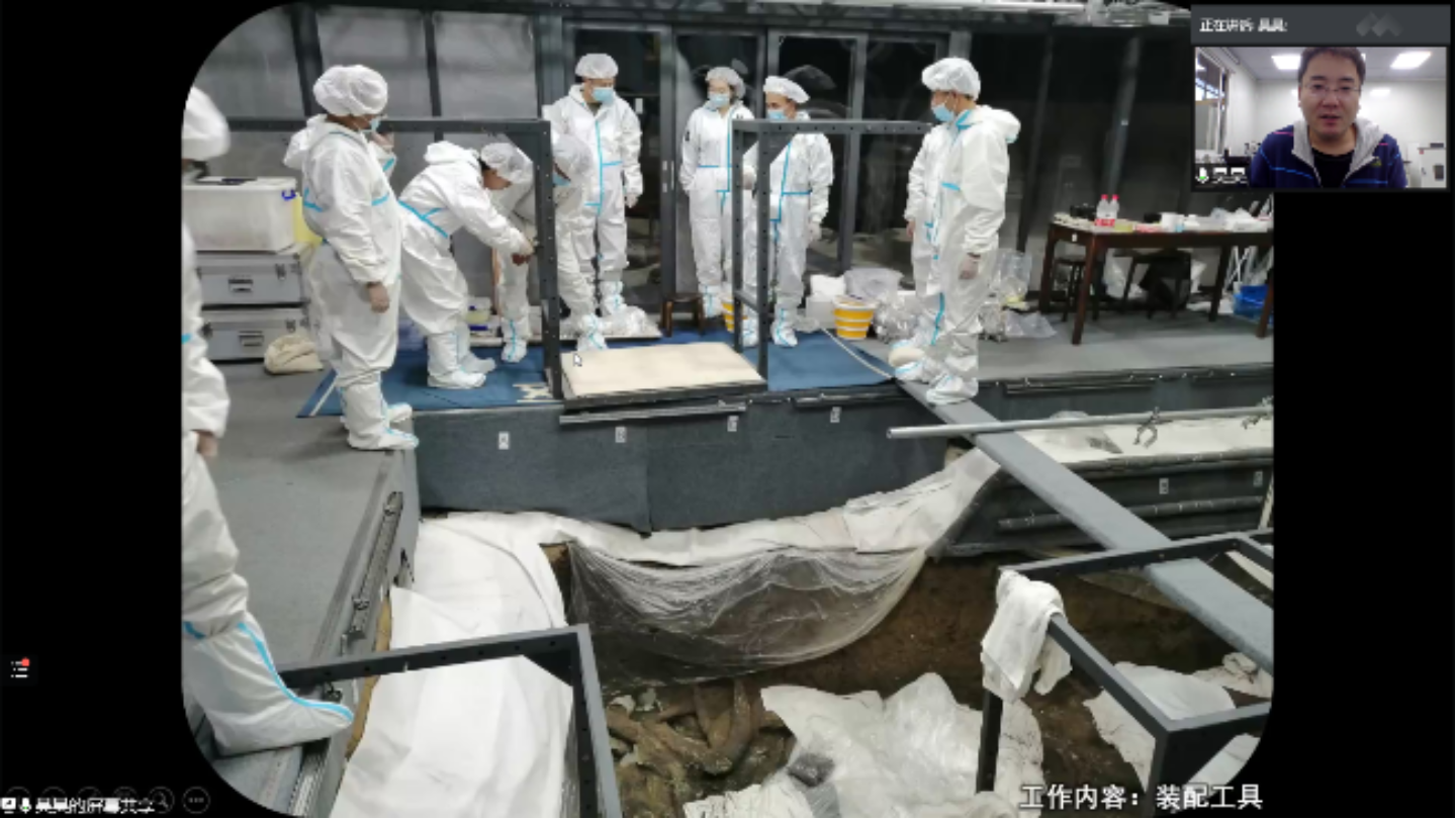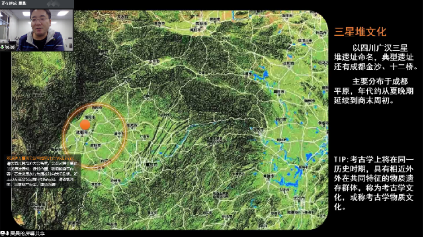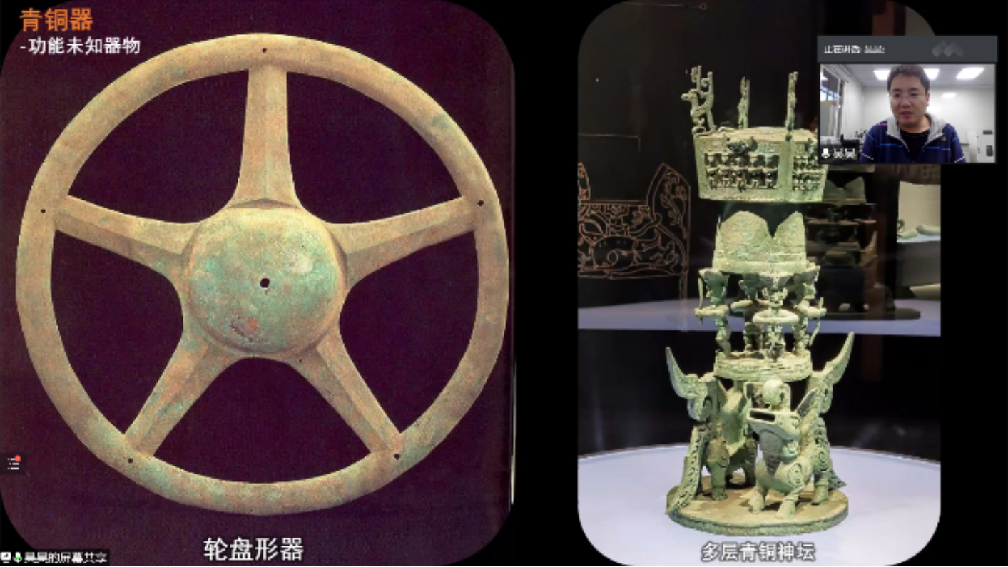 随后,赵昊老师从具体位置、考古起源、重点文物等方面进行对三星堆遗址的考古发掘情况进行了详细介绍。从考古学上讲,“文化”是同一历史时期具有相近外在共同特征的物质遗存群体的统称。三星堆文化以四川广汉三星堆遗址命名,典型遗址还包括成都金沙、十二桥,主要分布于成都平原,其年代约从夏晚期延续到商末周初。20世纪20年代末期,燕道成和燕青保父子在修缮自家庭院时意外发现三星堆玉器,后华西协和大学古物博物馆馆长葛维汉于1934年对其进行了首次科学的考古发掘,正式拉开了三星堆考古发掘的序幕。1986年,三星堆考古工作取得突破性进展,两座保存完好的大型祭祀坑被发现,相继出土了金、铜、玉、石、陶、贝、骨等珍贵文物近千件,其中青铜器的数量尤为庞大。2019年11月,6座新的祭祀坑又接连被发现,三星堆考古工作再次踏上新征程,其中北京大学也肩负着发掘8号坑的重要责任与使命。赵老师从编号、按件记录、装配工具、文物修复、微痕显微观察、室内清理、拉曼红外表征等诸多方面,充分介绍了北大考古团队在三星堆现场进行考古发掘和研究的具体过程,并通过线上视频直播的形式向同学们隔空展示了8号坑现场目前的发掘情况,同时就同学们有关文物修复、现场环境保护等问题进行了逐一解答。