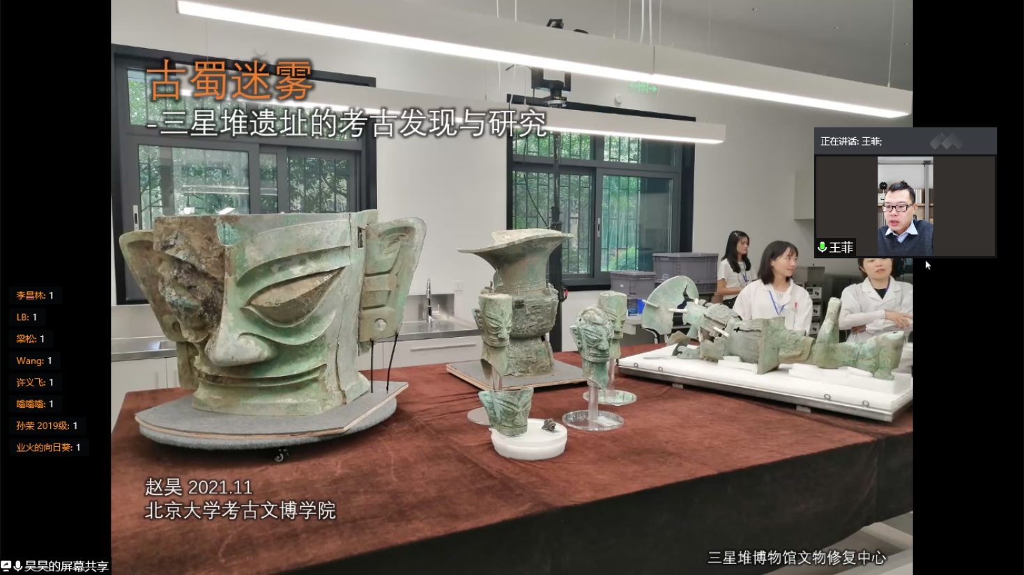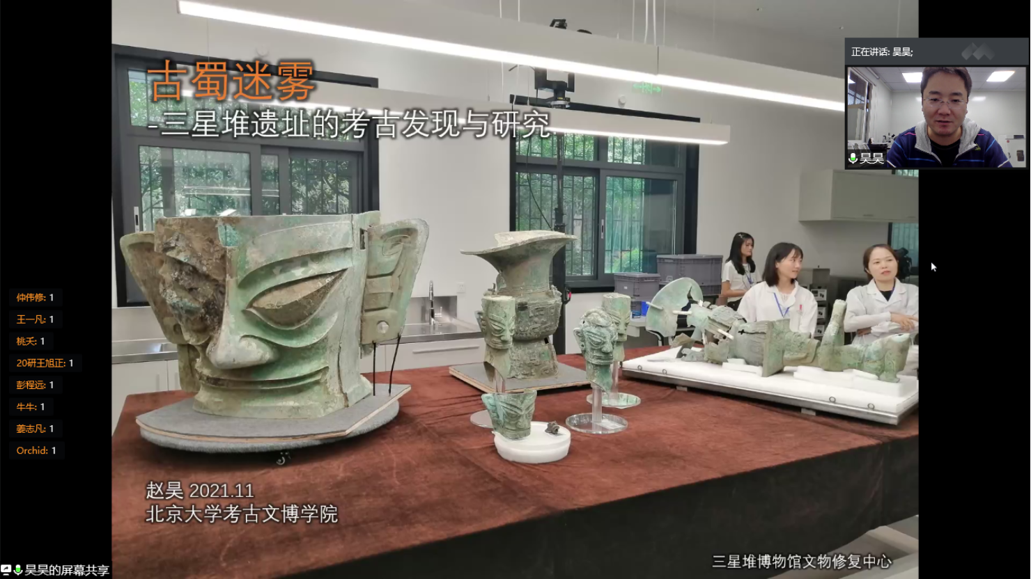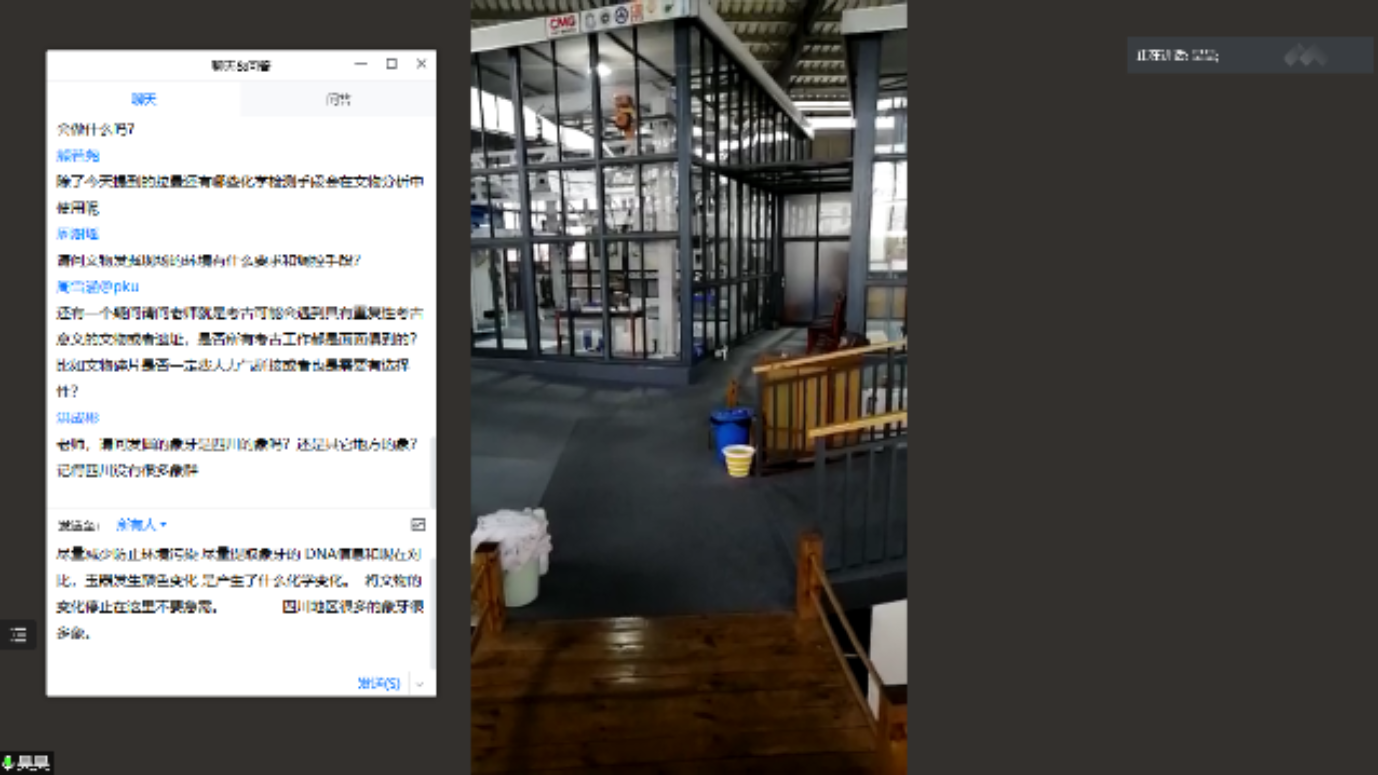 随后,赵昊老师从具体位置、考古起源、重点文物等方面进行对三星堆遗址的考古发掘情况进行了详细介绍。从考古学上讲,“文化”是同一历史时期具有相近外在共同特征的物质遗存群体的统称。三星堆文化以四川广汉三星堆遗址命名,典型遗址还包括成都金沙、十二桥,主要分布于成都平原,其年代约从夏晚期延续到商末周初。20世纪20年代末期,燕道成和燕青保父子在修缮自家庭院时意外发现三星堆玉器,后华西协和大学古物博物馆馆长葛维汉于1934年对其进行了首次科学的考古发掘,正式拉开了三星堆考古发掘的序幕。1986年,三星堆考古工作取得突破性进展,两座保存完好的大型祭祀坑被发现,相继出土了金、铜、玉、石、陶、贝、骨等珍贵文物近千件,其中青铜器的数量尤为庞大。2019年11月,6座新的祭祀坑又接连被发现,三星堆考古工作再次踏上新征程,其中北京大学也肩负着发掘8号坑的重要责任与使命。赵老师从编号、按件记录、装配工具、文物修复、微痕显微观察、室内清理、拉曼红外表征等诸多方面,充分介绍了北大考古团队在三星堆现场进行考古发掘和研究的具体过程,并通过线上视频直播的形式向同学们隔空展示了8号坑现场目前的发掘情况,同时就同学们有关文物修复、现场环境保护等问题进行了逐一解答。