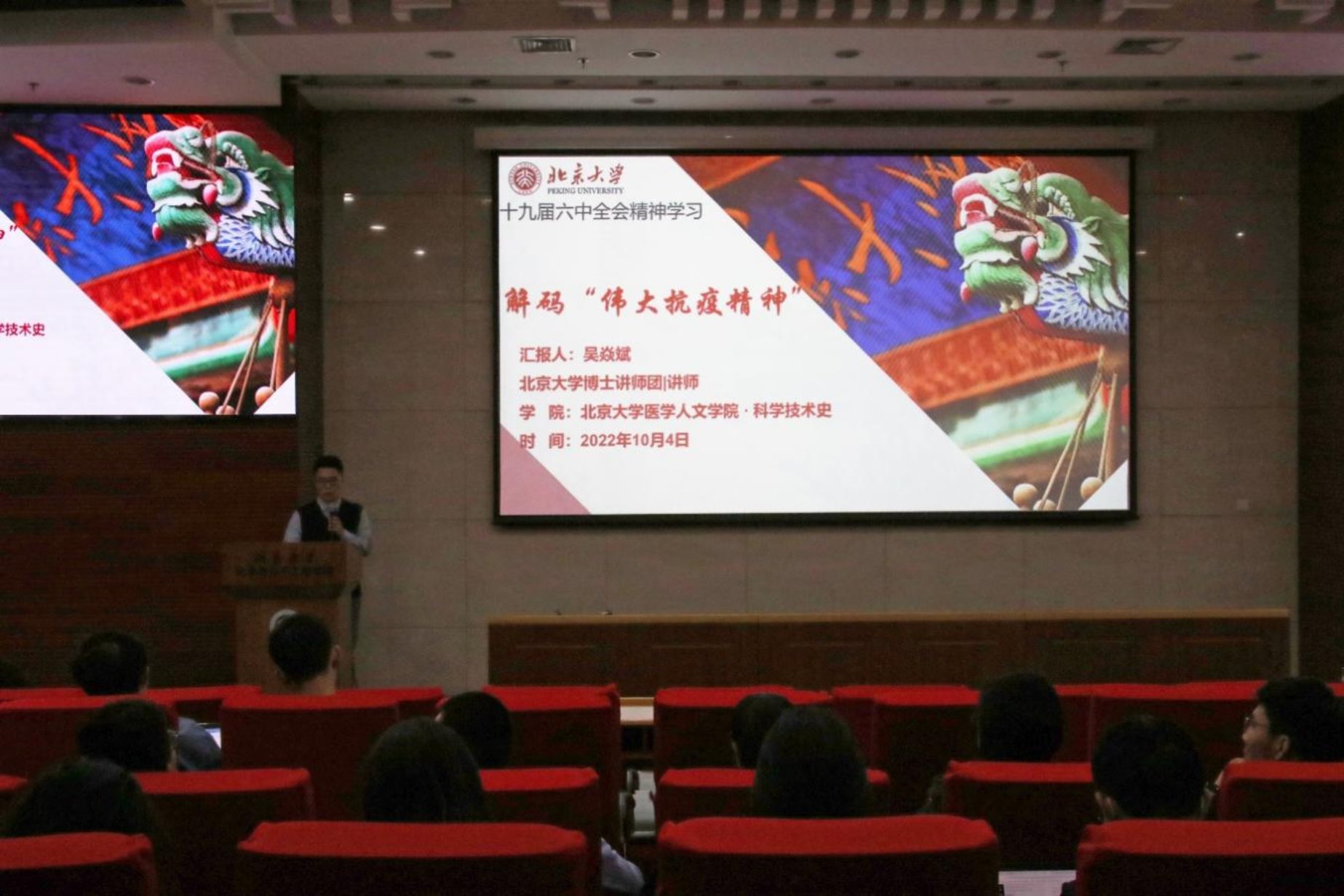 为深入学习十九届六中全会所传达的各项精神,2022年10月4日晚,本支部联合化院2021级研究生第一党支部以及无机分析团支部、高分子应化团支部、物理化学团支部、有机化生班团支部邀请了北京大学博士生讲师团的吴焱斌同学,为化院2021级研究生党团支部的全体133名同学带来了题为《解码“伟大抗疫精神”》的主题讲座。