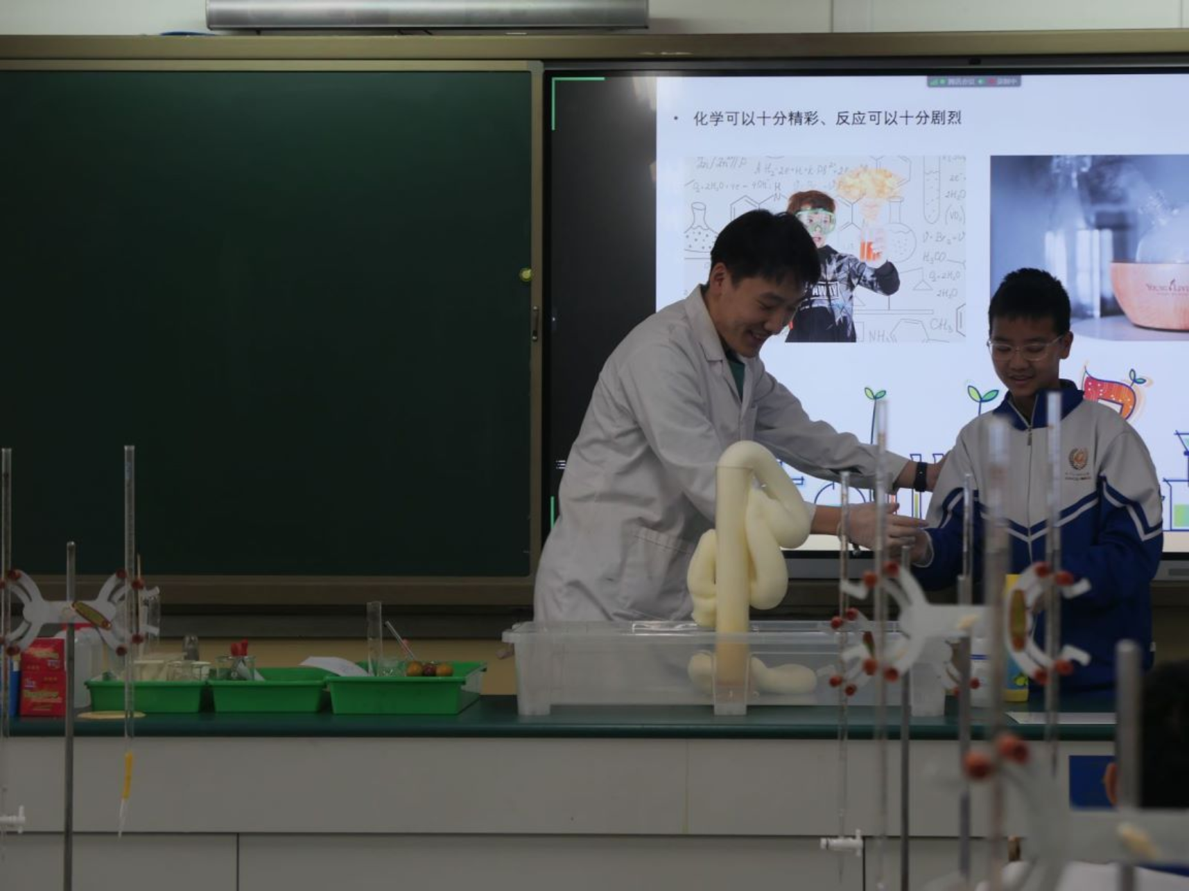 “什么是化学呢?”胡奕杰向同学们提出了本次课堂的第一个问题。同学们纷纷举手描绘自己心中的化学——有的同学认为它是五彩斑斓的烧瓶,有的同学认为它是能量的变换,有的同学认为它是复杂多变的……确实,化学是无处不在的,胡奕杰通过“大象牙膏”“黄金雨”与“风暴瓶”的实验让同学们亲眼看见化学可以十分的剧烈,可以多彩美丽,也可以变化莫测。同学们不禁欢呼“化学也太神奇了!”。