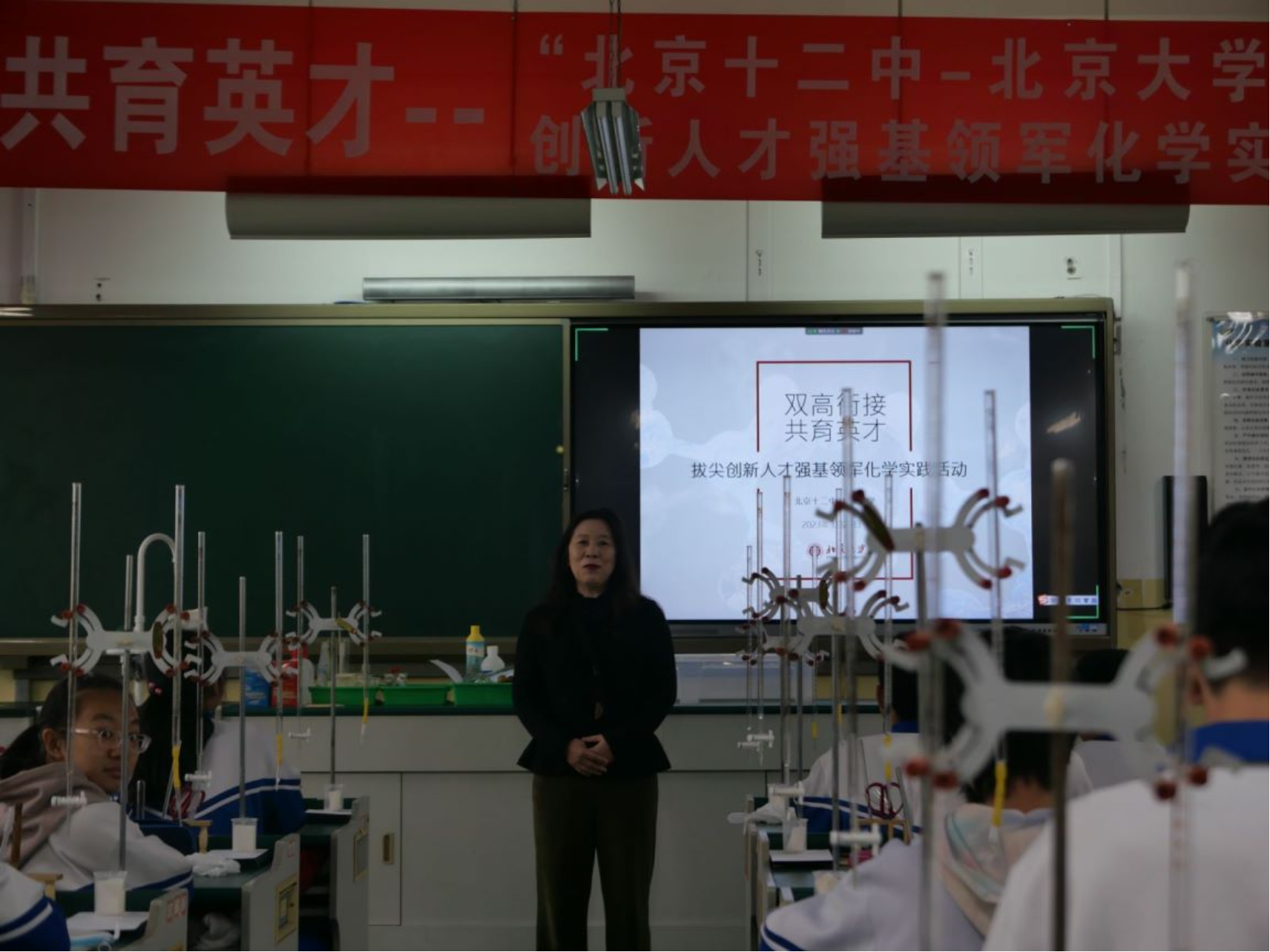 活动开始,北京十二中蒋炎富校长首先向来自北京大学化学学院的党员志愿者们表示热烈的欢迎。北京大学化学基础实验教学中心赵浩老师及化学与分子工程学院党支部成员对北京十二中的热情接待和前期准备表示感谢。接着,本次科普行活动领队黄超然,通过播放北大化学宣传片,向同学们展示了北京大学化学学科的学科特色。化学学科作为“中心科学”,是人们认识和改造自然社会的重要工具,生活中处处有化学。习近平总书记高度重视基础学科的发展,他在中央政治局三次集体学习时强调:“加强基础研究,是实现高水平科技自立自强的迫切要求,是建设世界科技强国的必由之路。”而科普是高校服务社会的重要一环。希望通过本次活动,让大家了解化学在现代生活中的应用和重要性,为同学们打开一扇“化学新世界”的大门,用全新的视角去认识世界。勉励大家努力学习,为国家和社会做出自己的贡献。